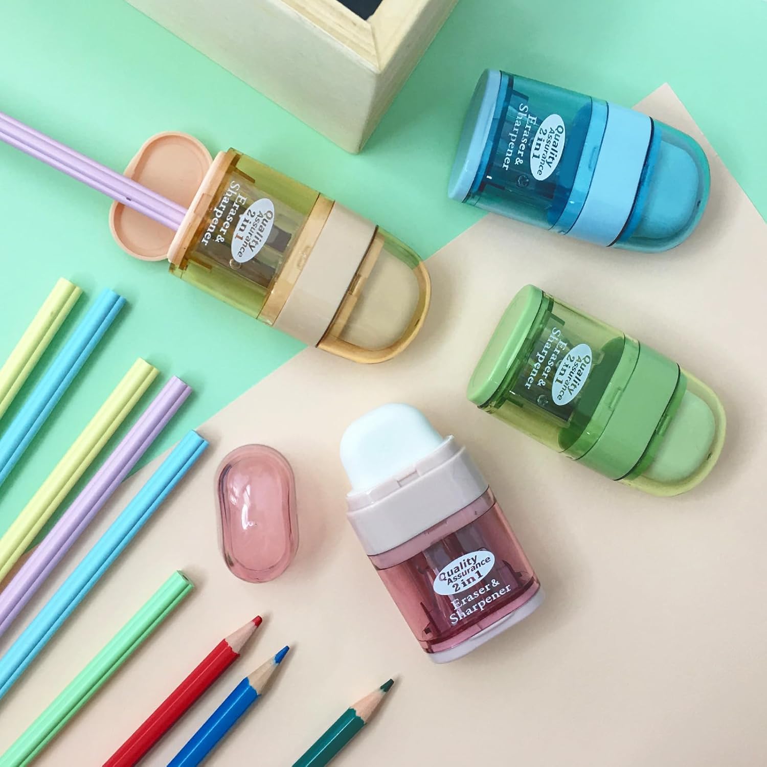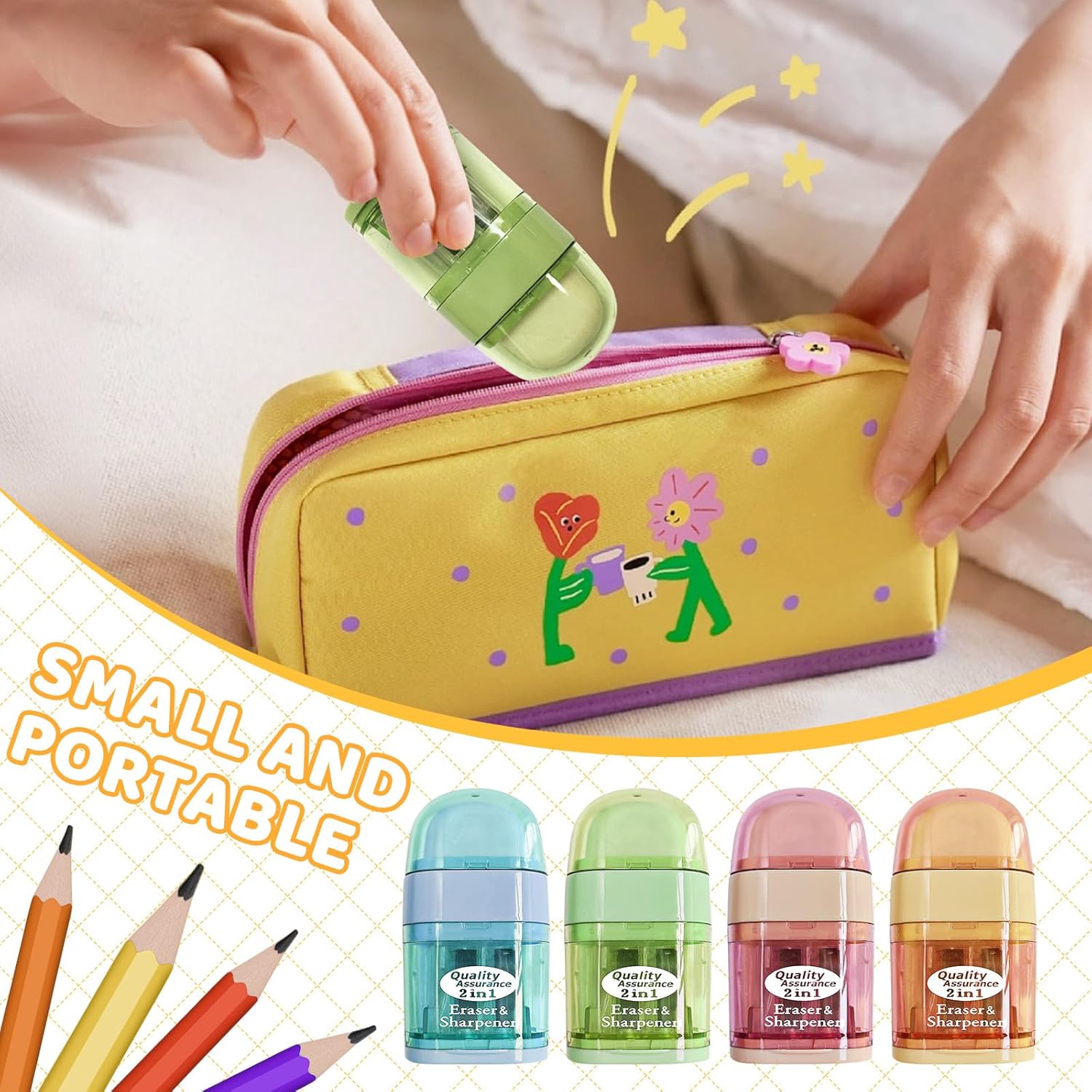 12 Pack Manual Cute Pencil Sharpener with Eraser Double Holes Multicolored Handheld Pencil Sharpener Preppy Back to University Supplies for Classroom Rewards