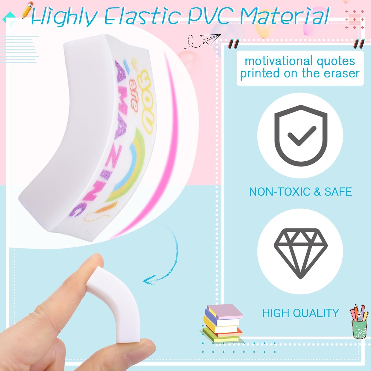 Inspirational Features: what sets our drawing eraser apart is the printed inspirational cute words on each item; Using these erasers not only helps you to correct mistakes, but also serves as a constant reminder to stay motivated, making every writing or drawing session inspiring and fun filled