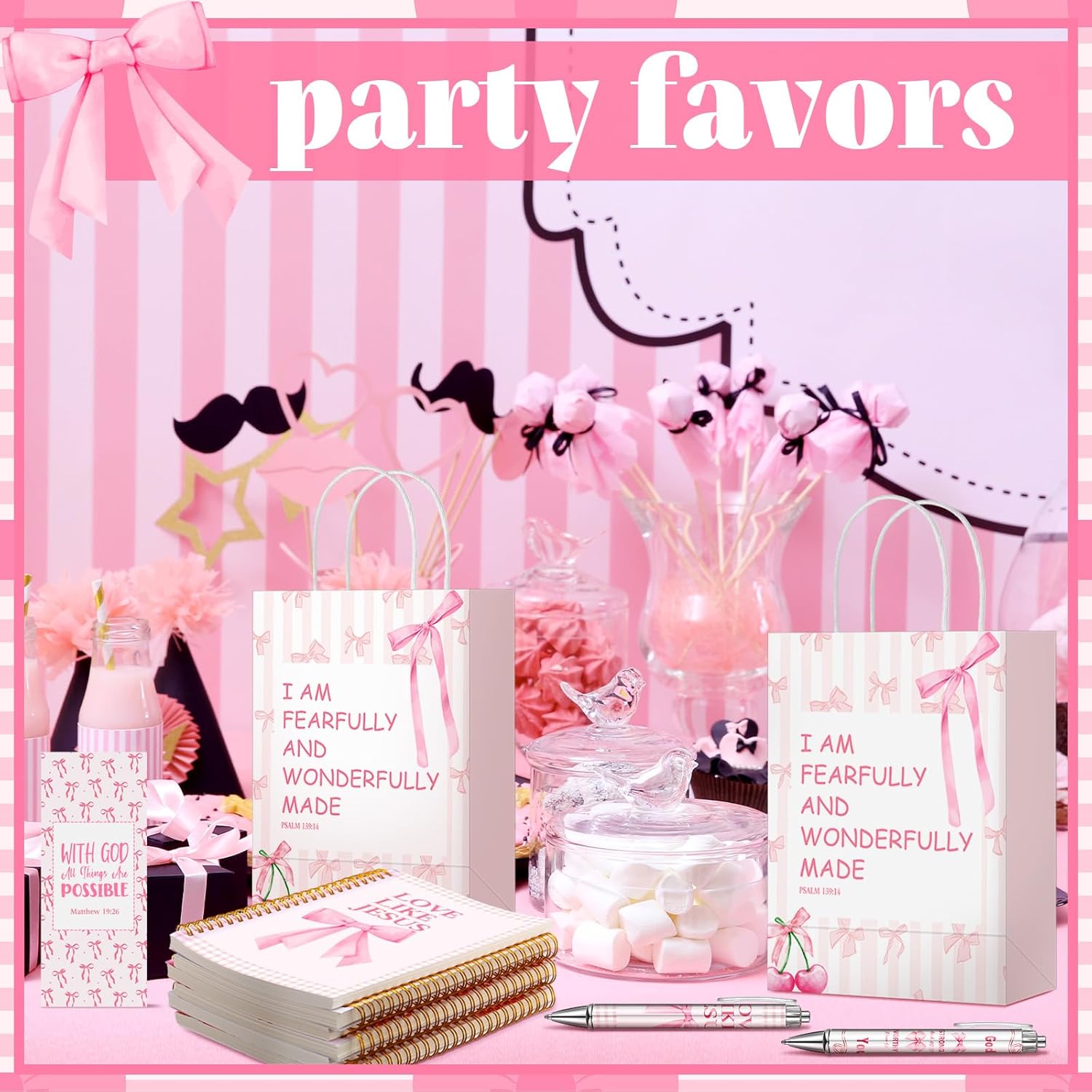 Pink Bow Coquette Bible Stationery Set: the pink coquette Christian gifts include 12 pink Bible notebooks, 12 pink Bible bookmarks, 12 pink Bible pens, and 12 pink bible gift bags, which are enough to meet your pink Bible party needs