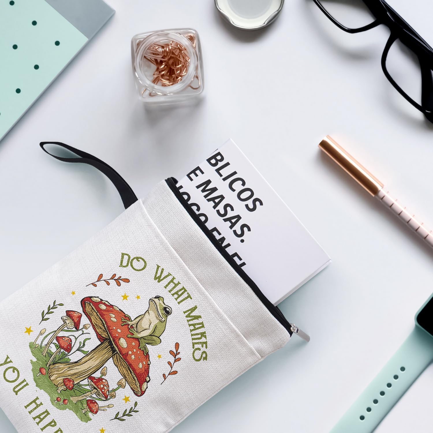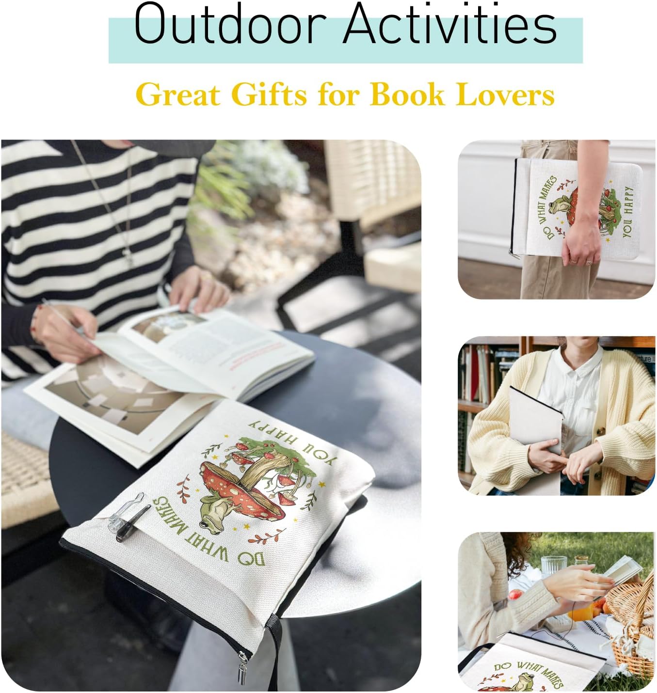 Do What Makes You Happy Inspirational Book Sleeve for Book Lovers, Bookish Group Club Gifts for Women, Funny Frog Mushroom Book Cover with Zipper and Front Pocket for paperbacks 9 x 12 Inch
