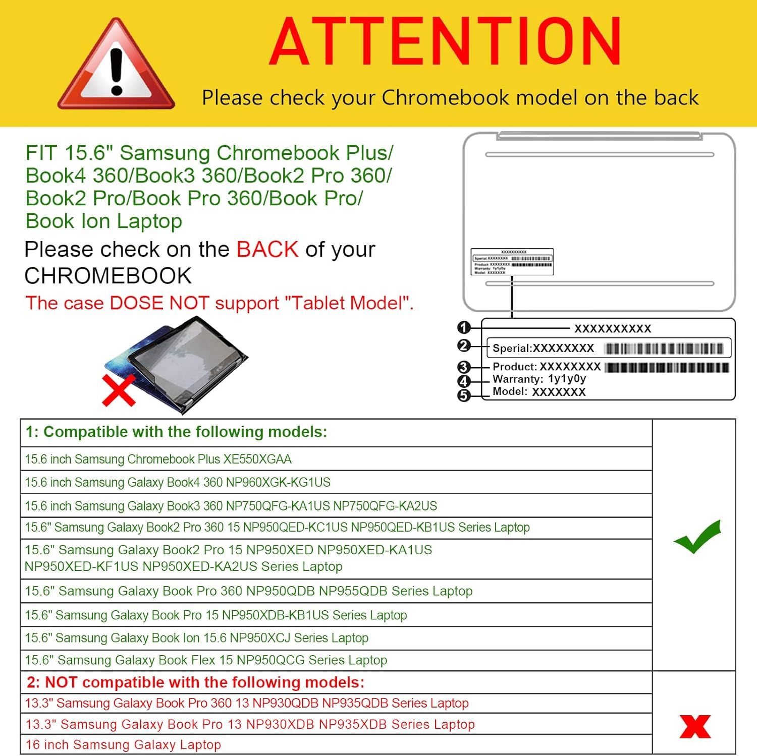 WARNING: The case is NOT compatible with 16 inch Samsung Galaxy Laptop, 13.3 inch Samsung Galaxy Book3 360 NP730QFG Series Laptop, 13.3 inch Samsung Galaxy Book Pro 13 NP930XDB NP935XDB Series Laptop.