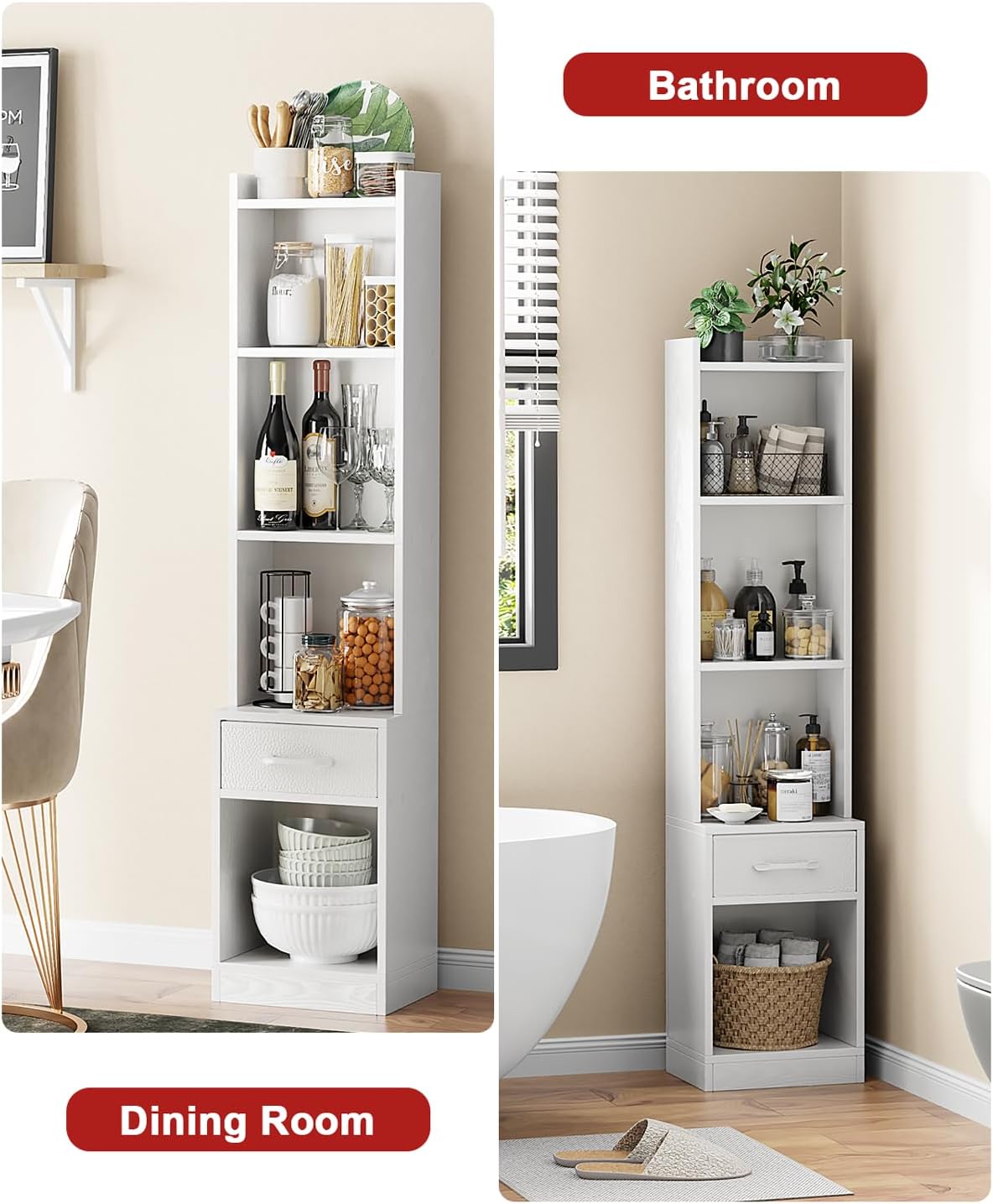 Furologee White Bookshelf with Drawer, 5 Tier Narrow Wood Display Book Shelf, Modern Cube Corner Bookcase Freestanding, CD Storage Bookshselves for Bedroom Living Room Office