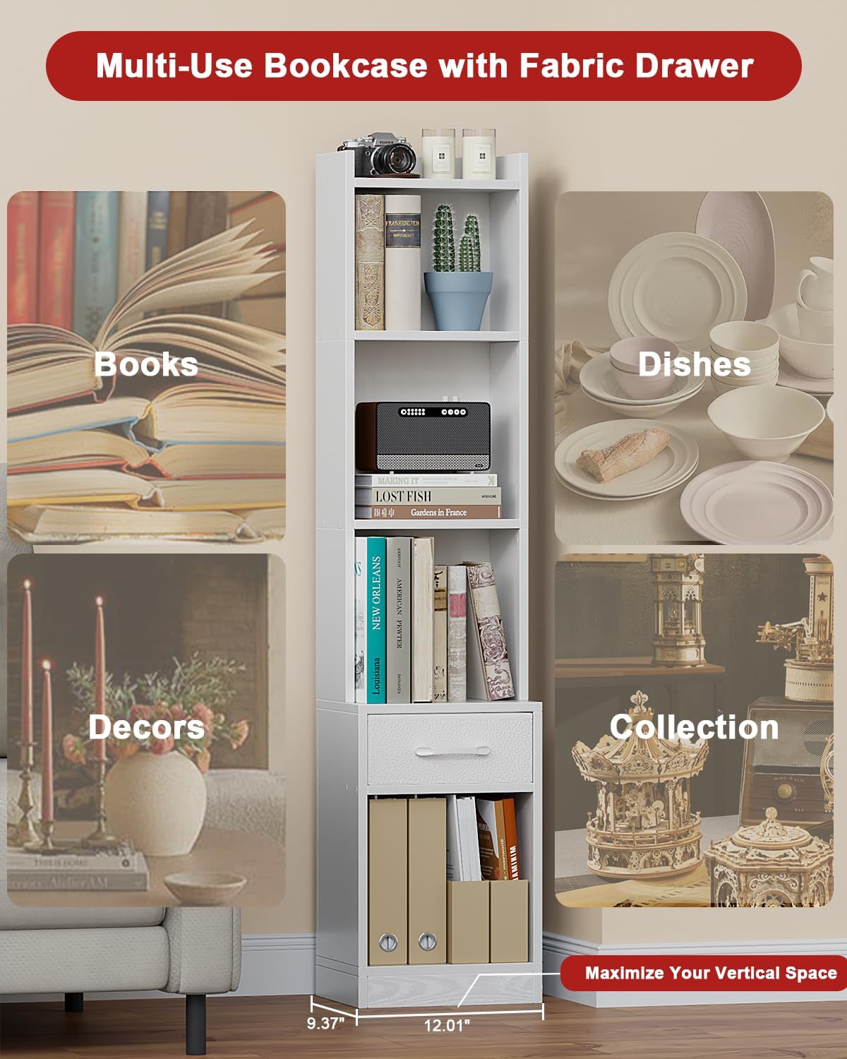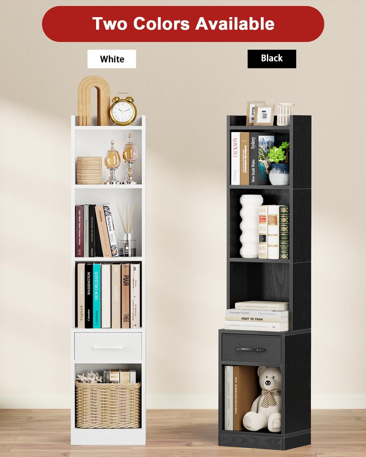 Space Saving 5 Tier Book Case: Designed as a small bookshelf for small spaces, the vertical bookcase(9.37″W x 12.01″D x 53.36″H) fits snugly into corners, apartments, or kids’ rooms, maximizing storage without sacrificing floor space. Available in white bookcase and black shelf finishes, this shelf stand unit effortlessly blends with modern farmhouse, minimalist, or industrial decor