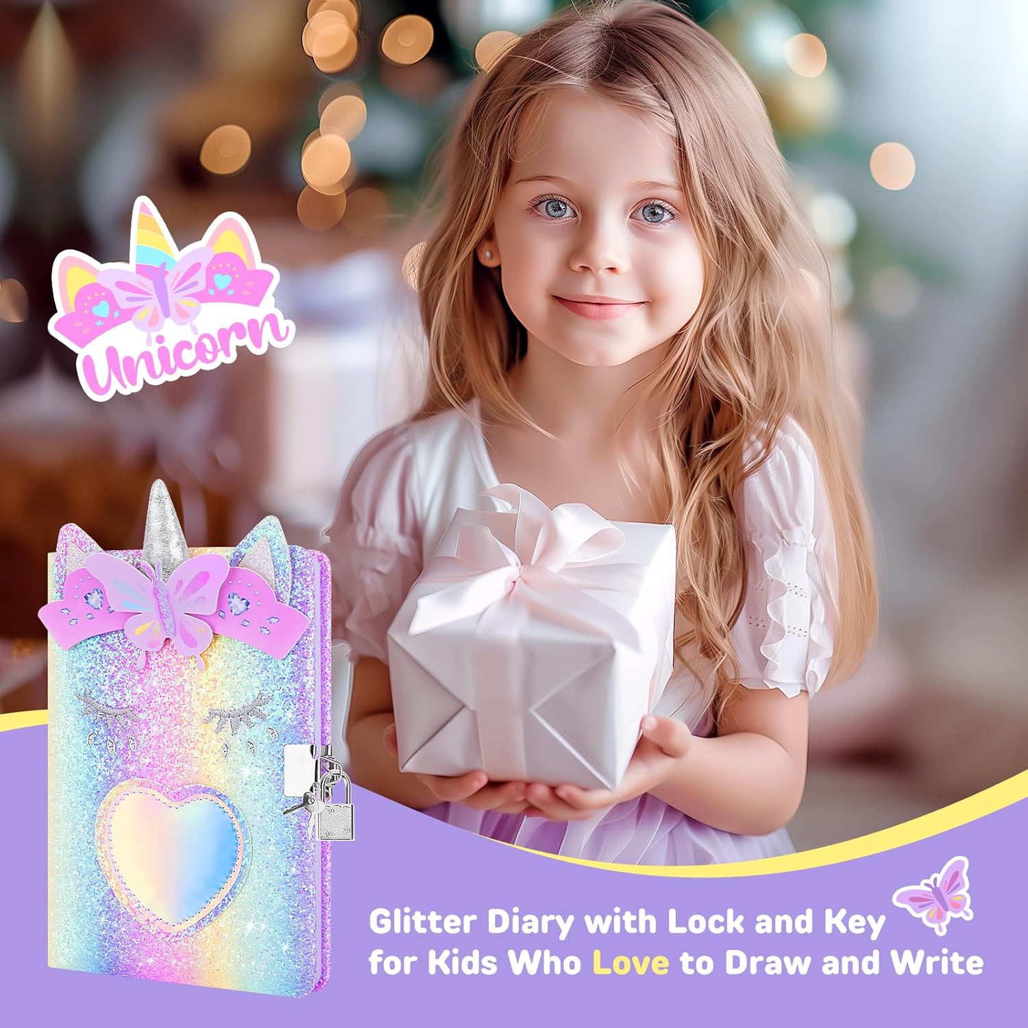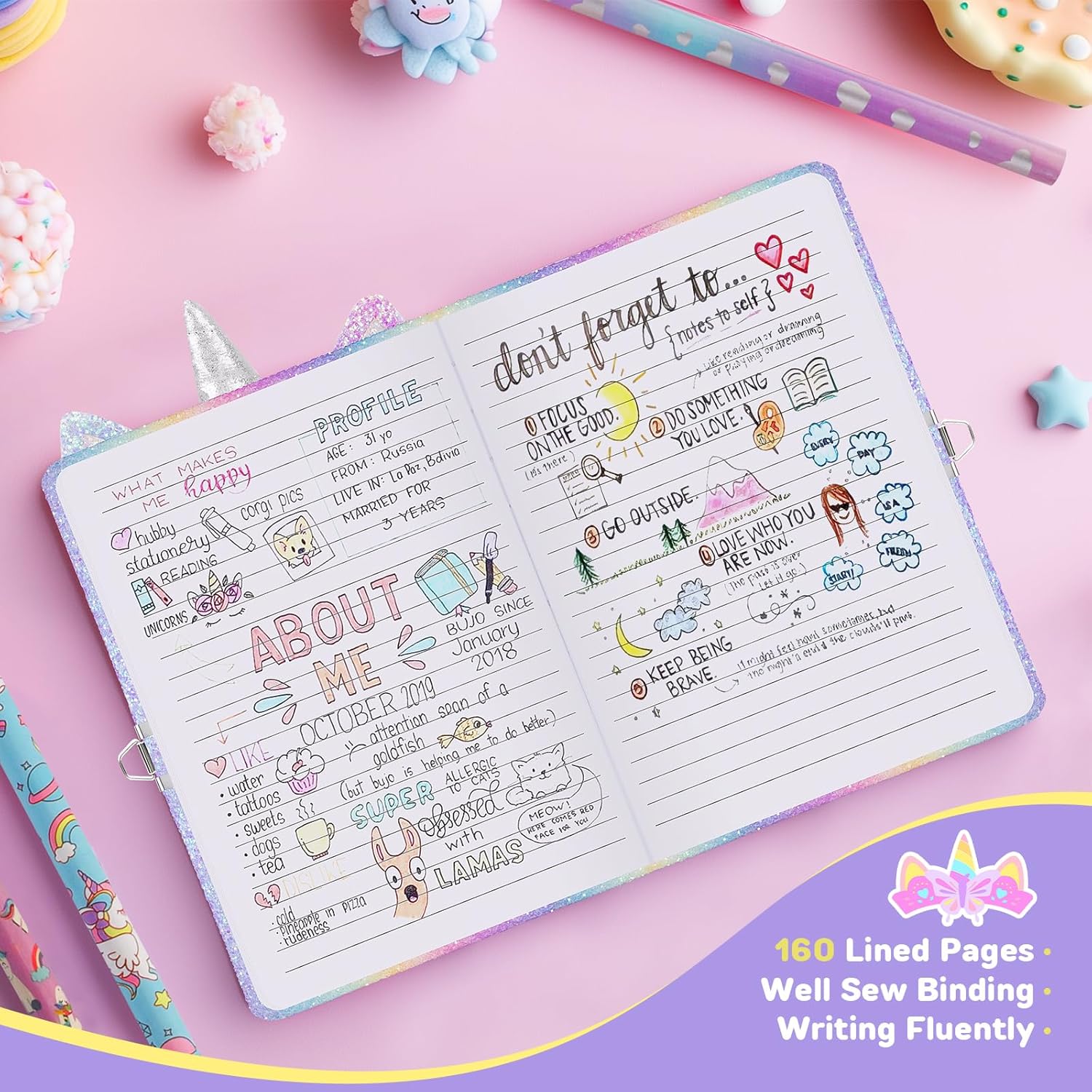 homicozy Unicorn Diary with Lock,Gift for 6 7 8 Year Old Girl,Glitter Seceret Journal for Kids with 160 Pages,Shiny Notebook for Writing and Drawing,Cute Stationery Back to School Gift
