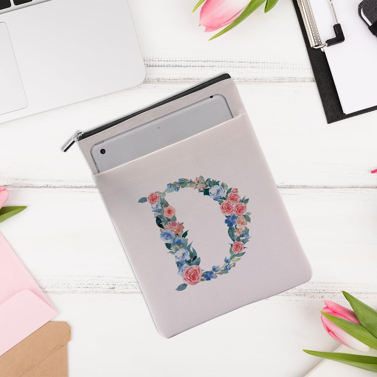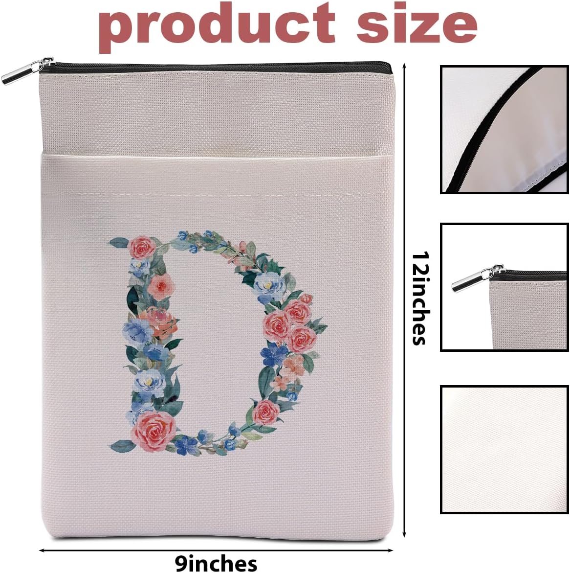 Initial D Book Sleeve Book Pouch with Zipper Washable Book Covers for Hardcover Personalized Reading Accessories for Book Lovers Book Club Gifts Monogrammed Gifts for Women Girls Daughter Reader