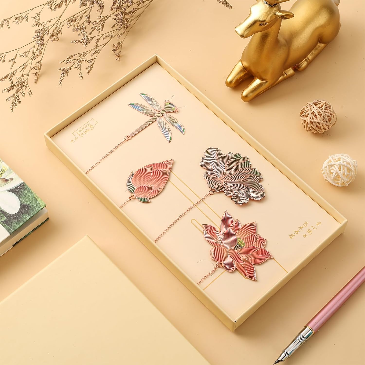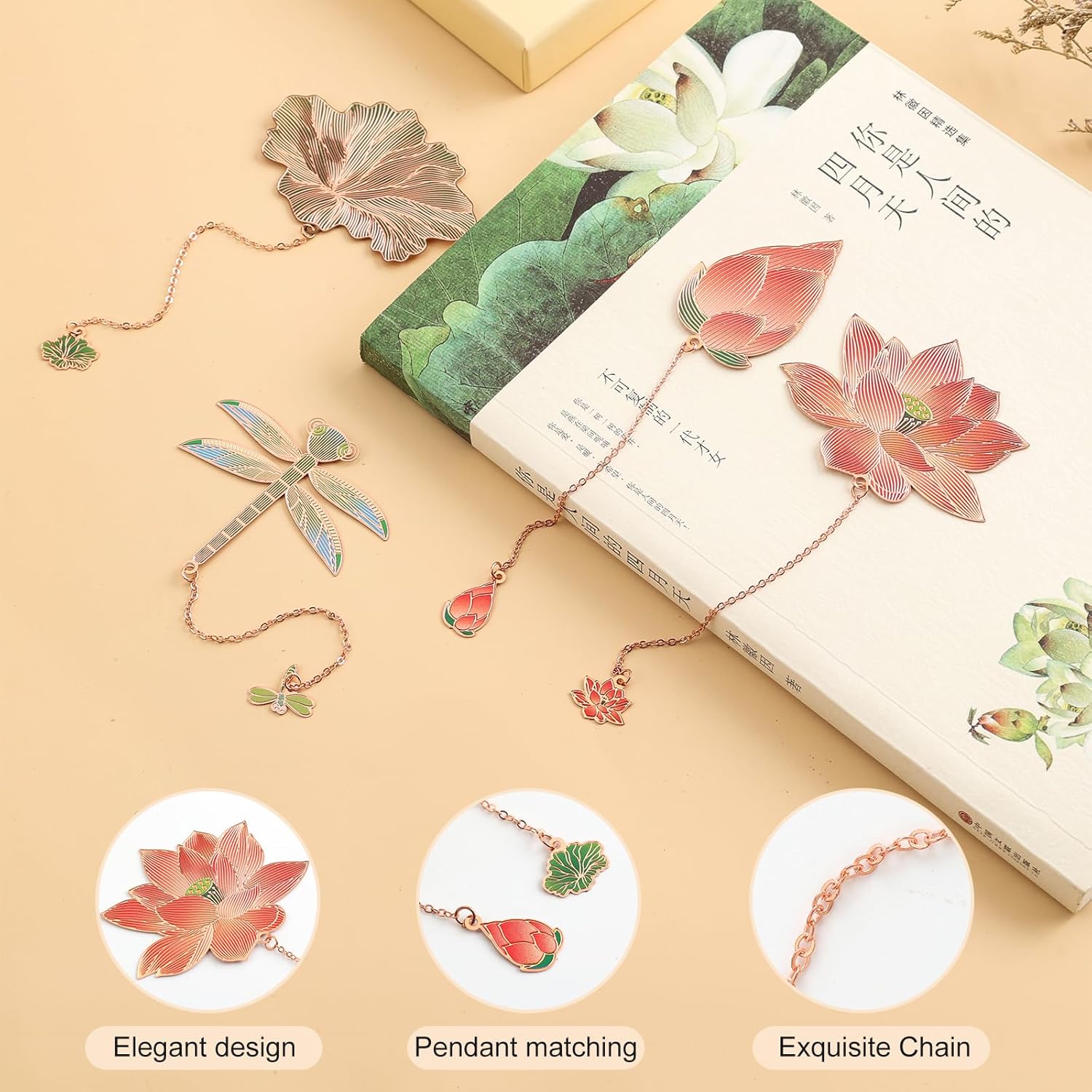 Unique Design: Bookmark is designed with 4 patterns, dragonfly; leaves; lotus. The pattern under the chain is exquisite and realistic