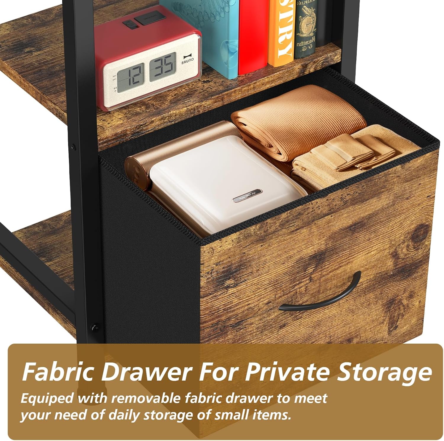 Bookshelves with Drawer:Vintage standing book shelf comes with a fabric drawer in size 13.4″Lx11.2″Wx10.21″H, which add extra privacy storage space. The foldable drawer is made of cardboard covered with cloth, which is lightweight and soft to be save to use in the nursery or kids room. The drawer is removable and foldable for easy storage when you don’t need it.