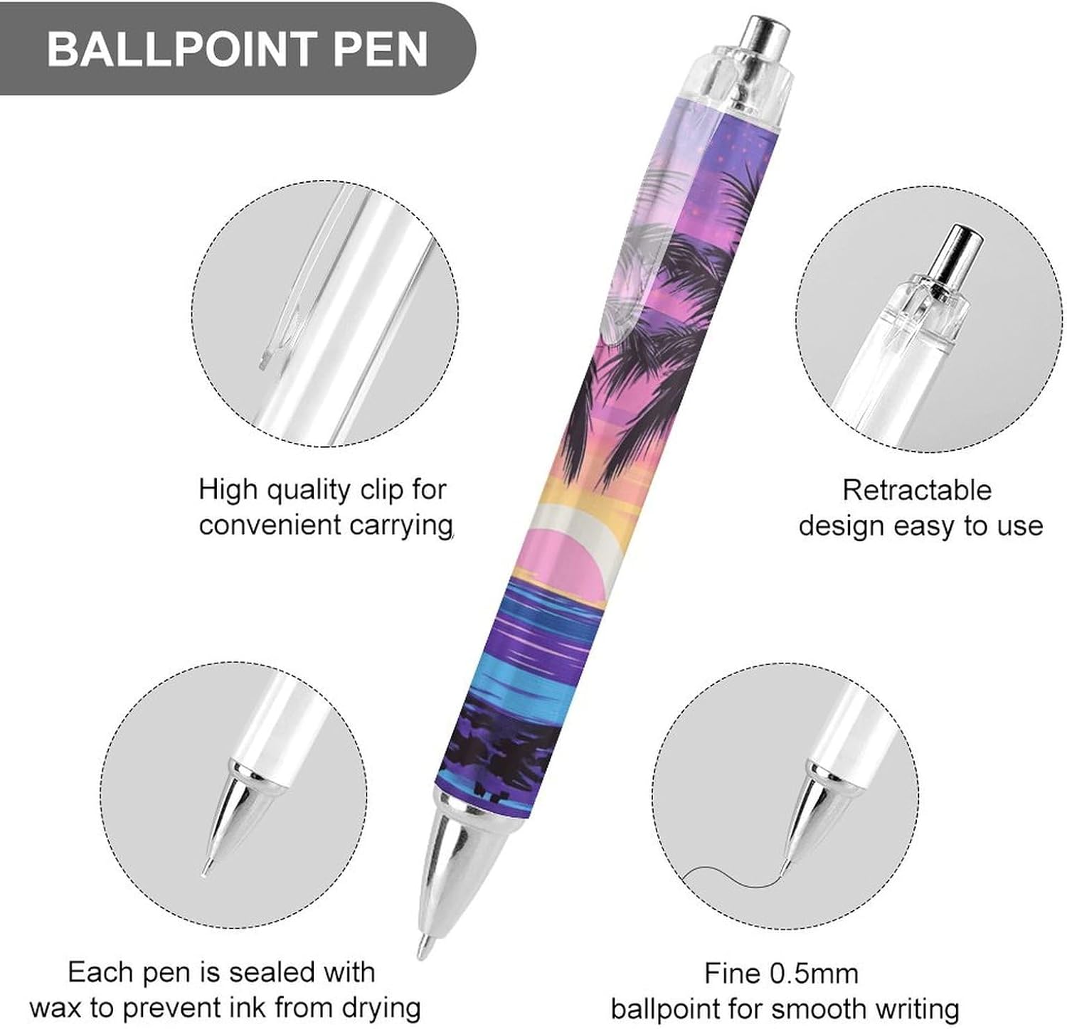 Palm Trees Beach Surf Sunset Ballpoint Pens Black Ink Retractable Writing Pens for Work Business 4 PCS