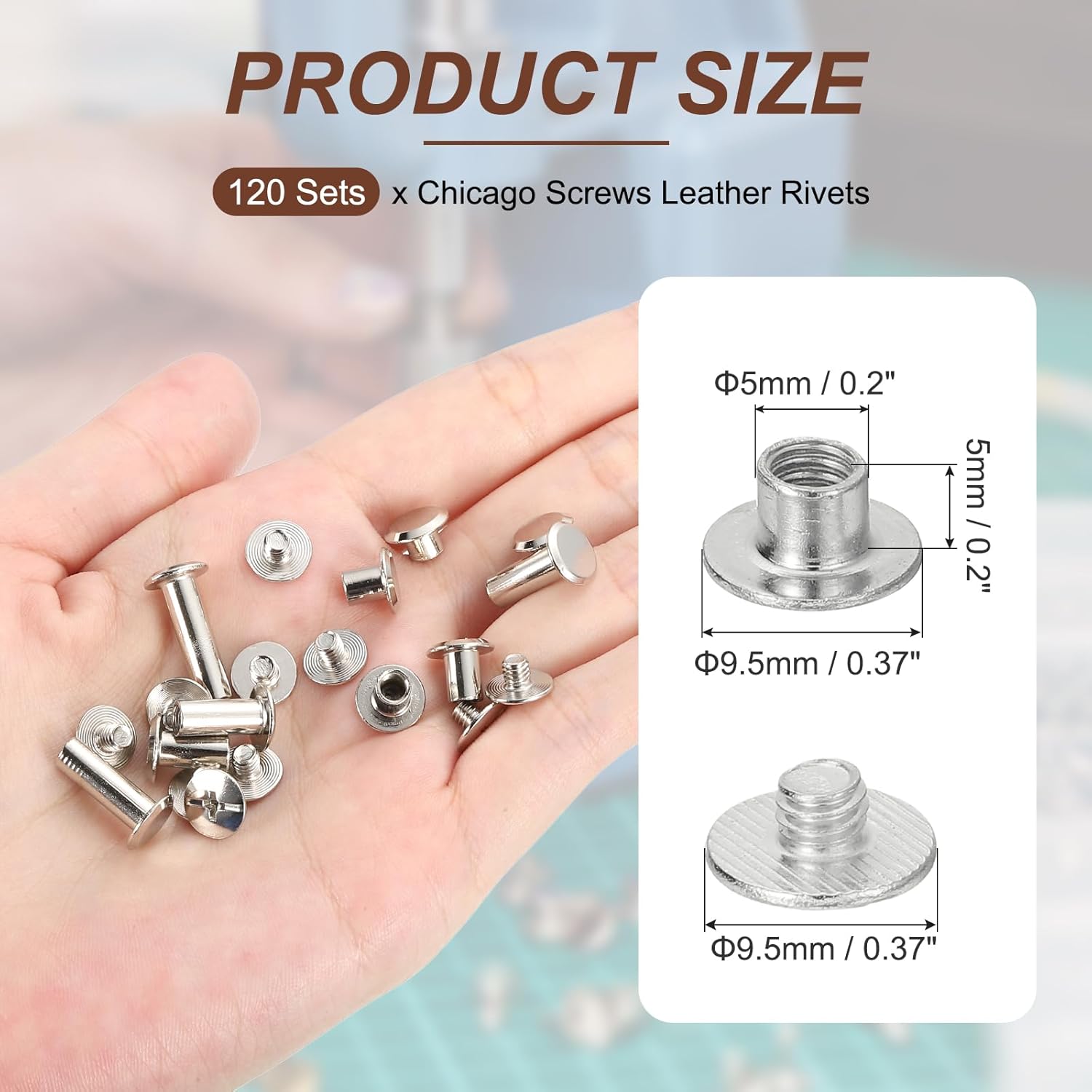 Specification: Color: Silver Tone; Material: Carbon Steel; Diameter: 9.5mm / 0.37″(Cap), 5mm / 0.2″(Rod); Length: 7.5mm / 0.3″(Total Length), 5mm / 0.2″(Rod Length); Packing List: 120 Set x Chicago Screws Leather Rivets
