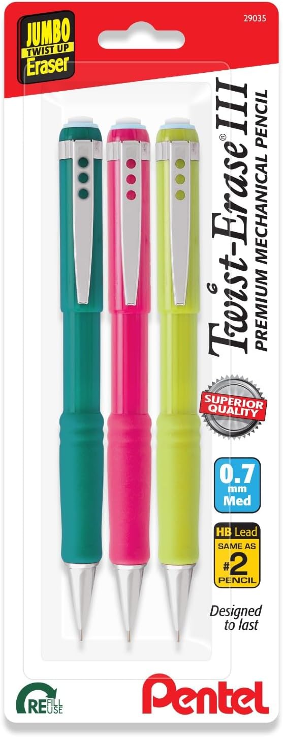 Pentel Twist-Erase III Mechanical Pencil, 0.7 mm, Assorted Barrel Colors, Pack of 3