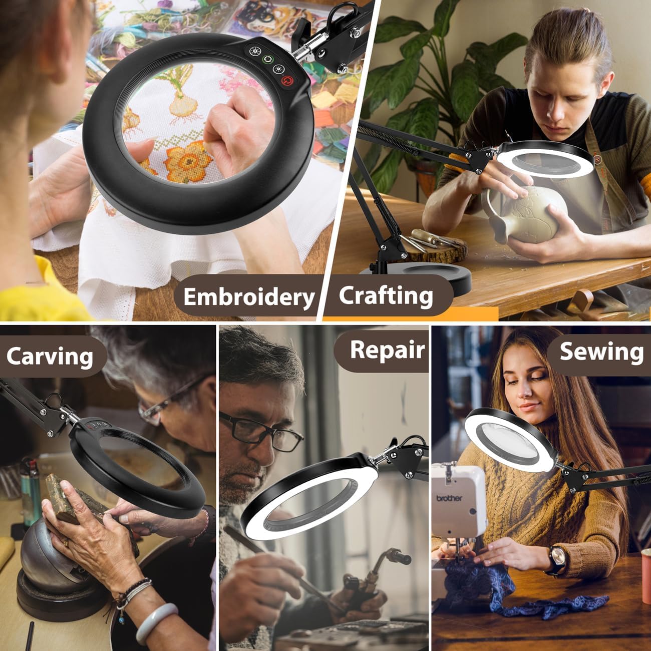 Hands-Free Swing Arm & Eye-Friendly Illumination: Featuring 2 interconnected swing arms with 4 strong support springs, our magnifying lamp locks the arm and lens securely in place with adjustable knobs, leaving your hands free. Say goodbye to the hassle of holding a heavy, uncomfortable magnifier. The ring-shaped LED aperture design provides a smooth and even light, making it suitable for estheticians, artists, engineers, repairers, coin collectors, watchmakers, architects, and more.