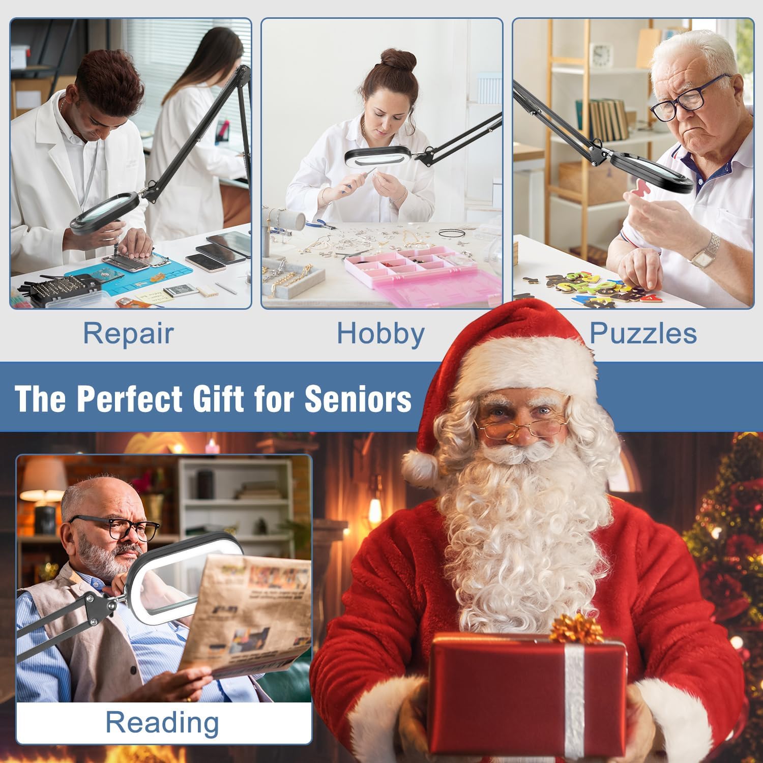 5 Color Modes & Stepless Dimmable: Transform your workspace with our magnifier, designed to eliminate harsh glare and provide soothing illumination. Featuring 5 adjustable color modes and stepless dimming, you can easily find the perfect brightness for any task. Whether you need cool white for detailed work or warm light for comfortable reading. This flexibility reduces eye strain and enhances comfort during extended use, making it ideal for professionals, enthusiasts, and seniors alike.