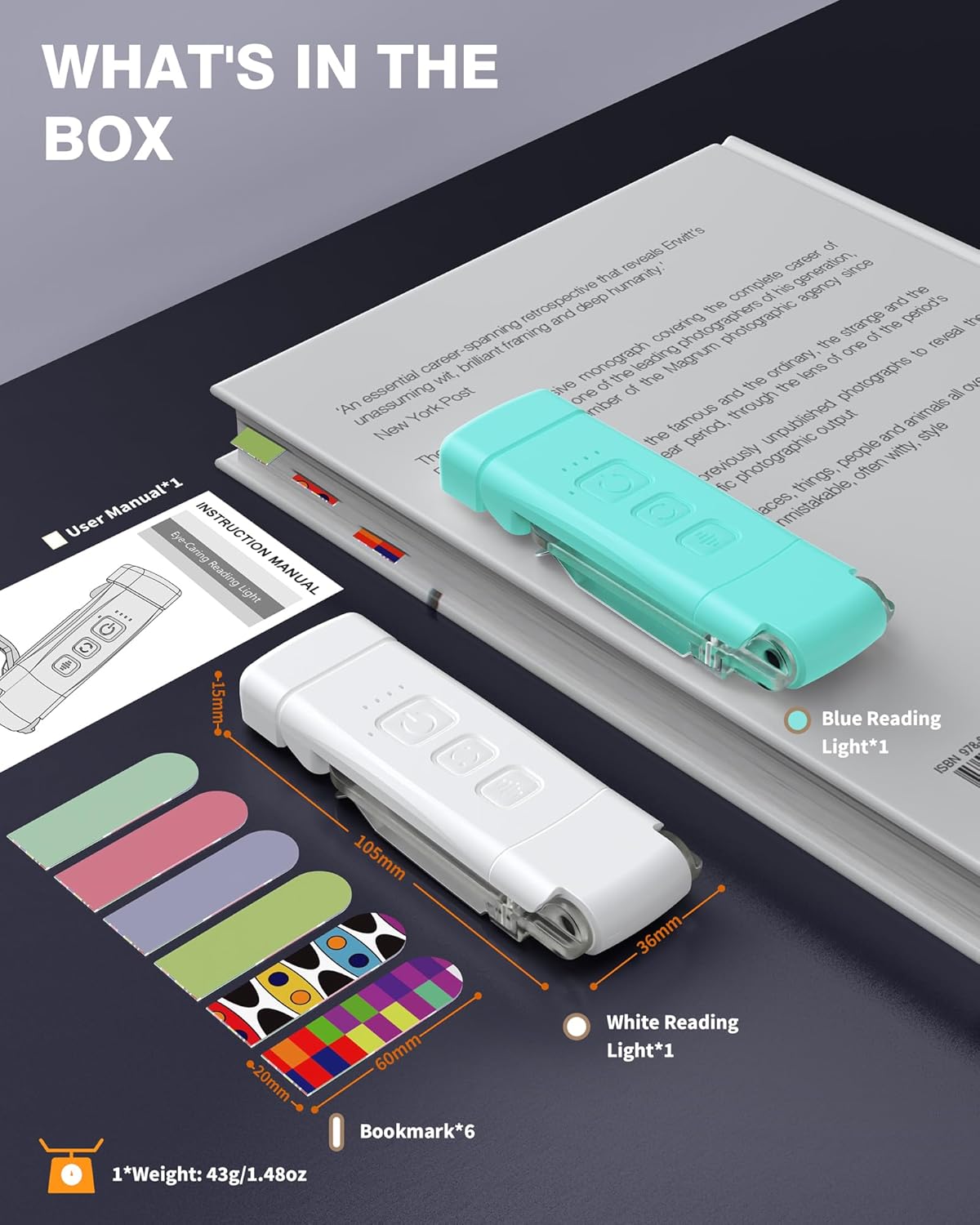 LIGHTWEIGHT & PORTABLE DESIGN: This reading lights for books in bed weighs only 1.37 ounces (39g). When you clip it on a book, you can barely feel its weight. Its small and flexible design makes it easy to carry and put into a backpack, taking up very little space. It’s perfect for reading in bed at night, at home, while traveling, on airplanes or trains, in cars, etc.