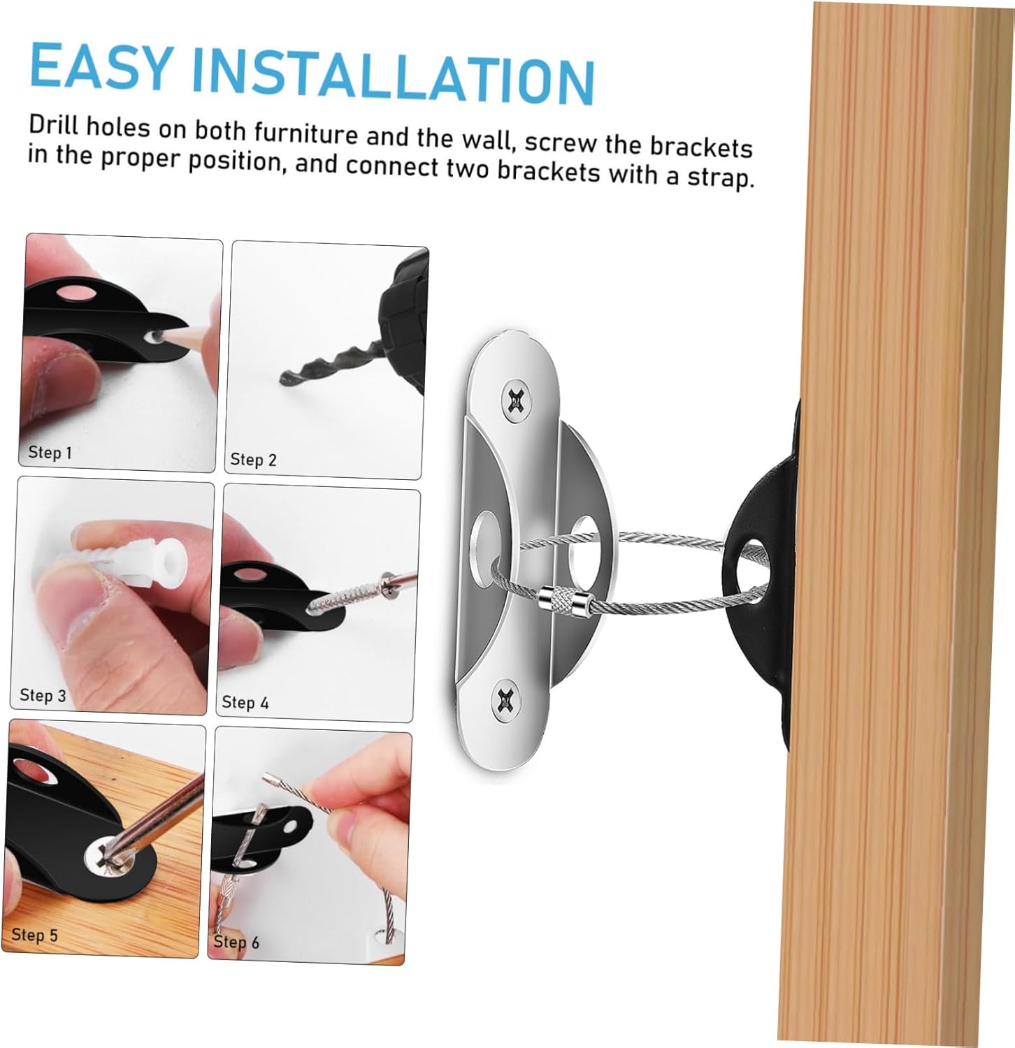 – Easy installation: Drill holes on both furniture and the wall, screw the brackets in the proper position, and connect two brackets with a strap anti tip kit.