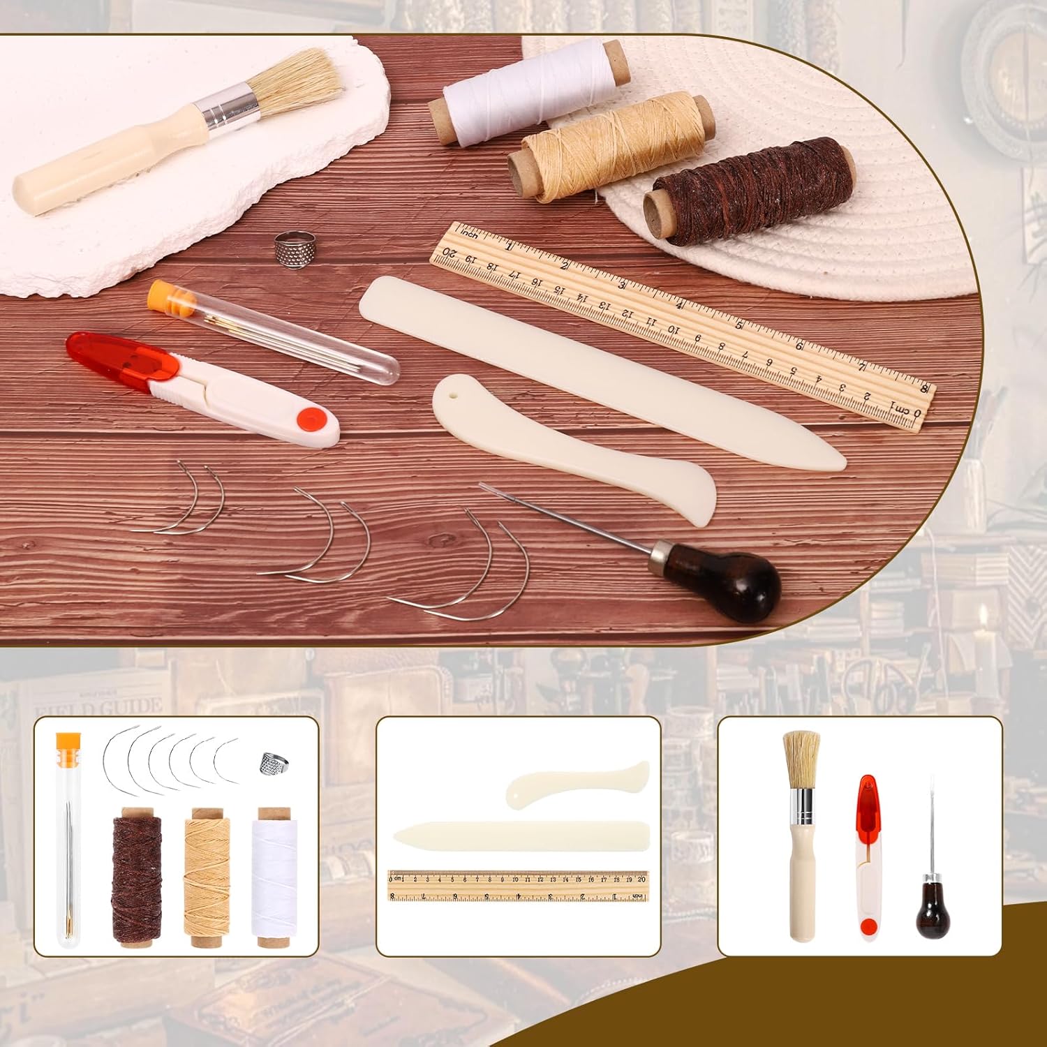 Quantity:23 Pieces(6 x large-eye needles for bookbinding,6 x curved needle,3 x waxed thread, 2 x bone folder paper creaser,1 x ruler, 1 x needle bottle, 1 x scissors,1 x glue brush,1x thimble ring, 1 x wood handle awl )