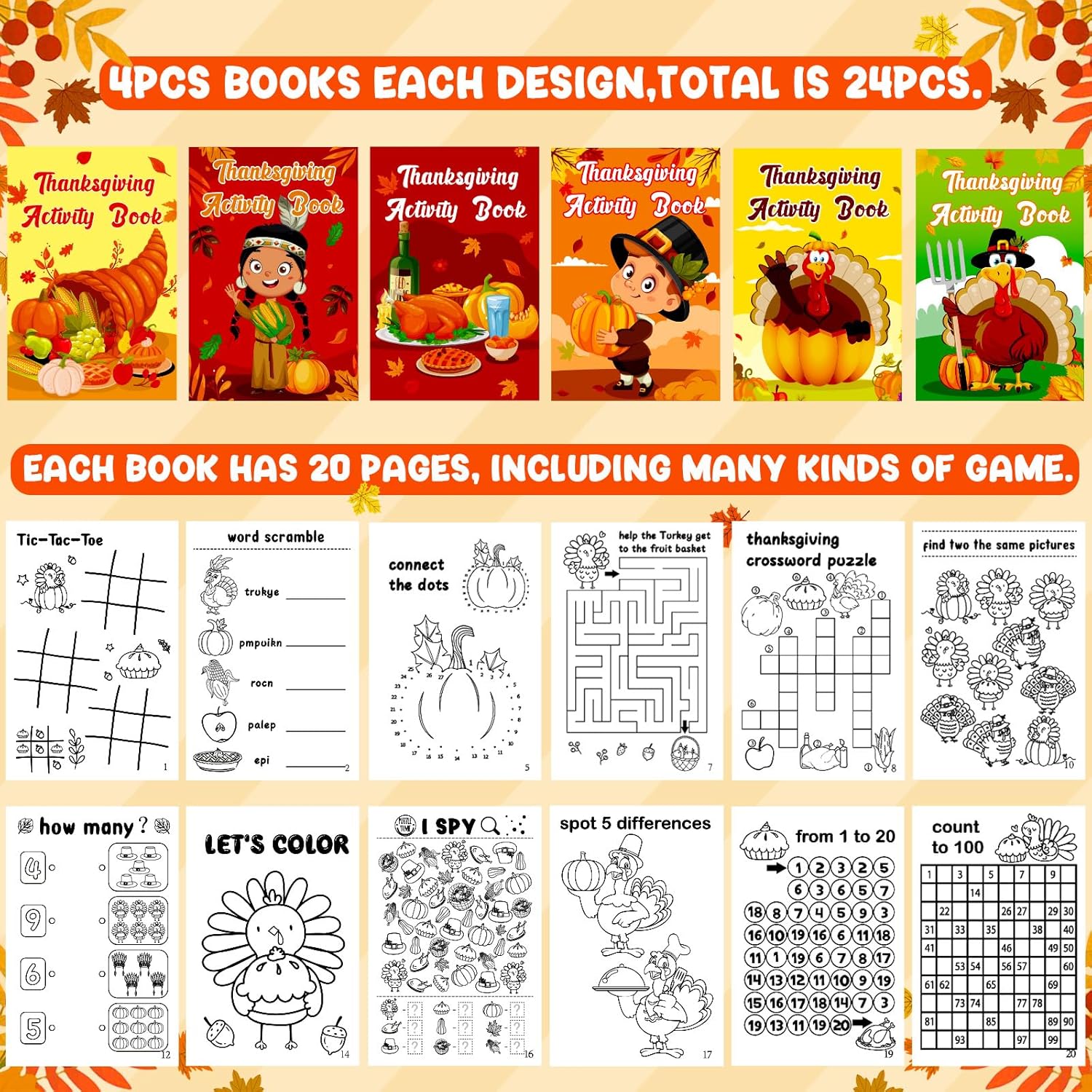 Bulk Set for Easy Gifting: Each set includes 24 activity books in 6 designs, making it ideal for sharing with classmates, friends, or family during thanksgiving