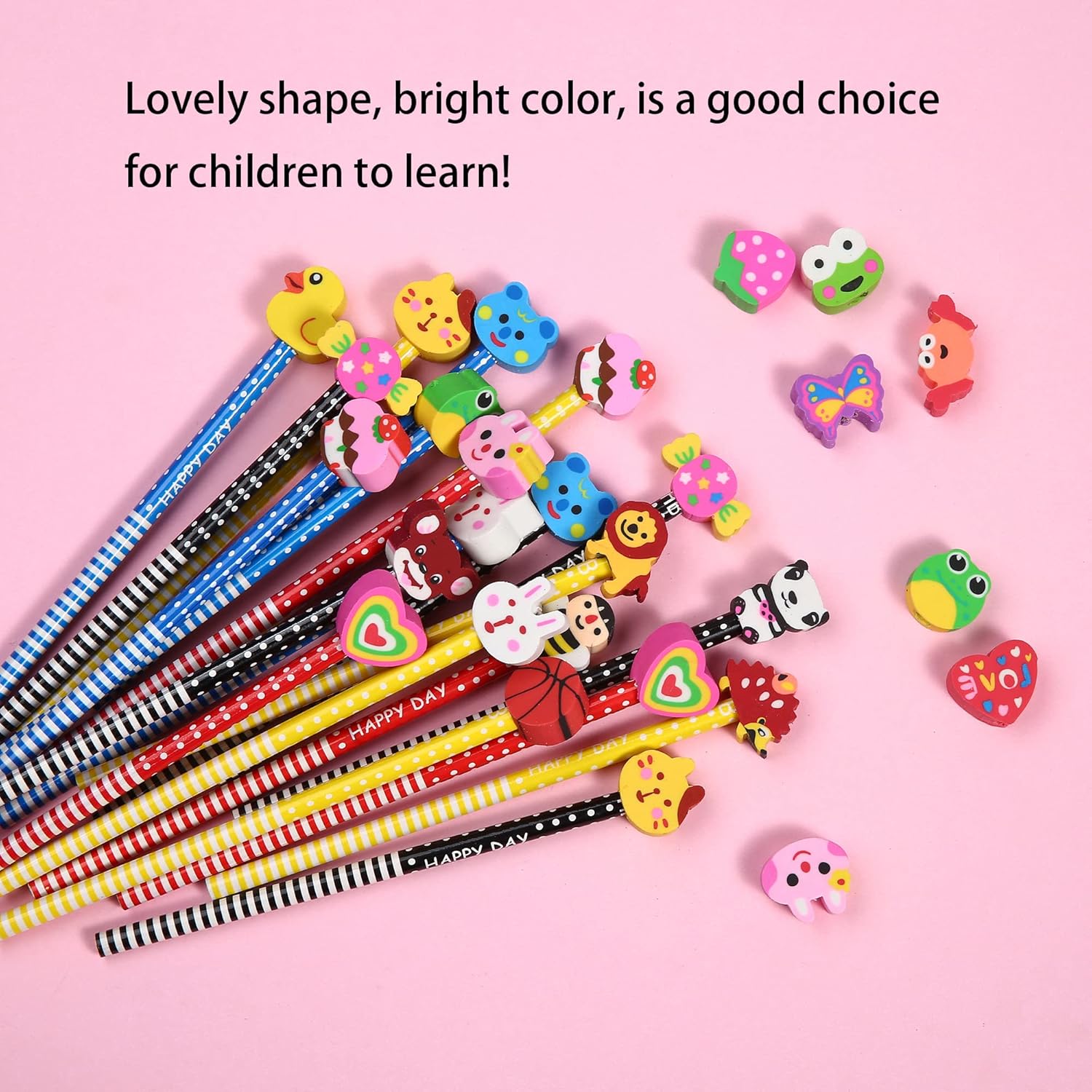 2.Each pencil is decorated with lovely color stripes, and the top of the pencil is embedded with different styles of lovely animal and fruit cartoon erasers.