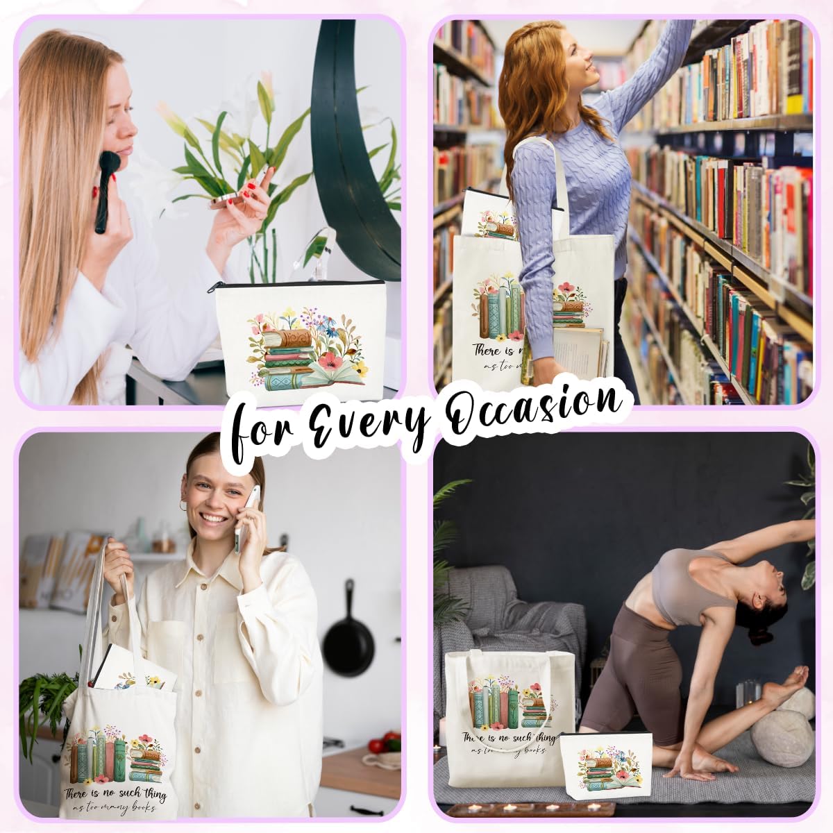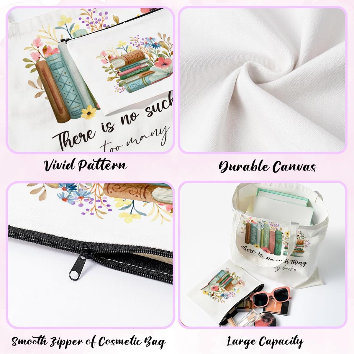 2Pcs Book Lovers Gifts Canvas Book Tote Bag Small Makeup Bag, Book Lover Gifts for Women Librarian Readers Sister Bookish Gifts Bookworm Gifts for Book Lovers