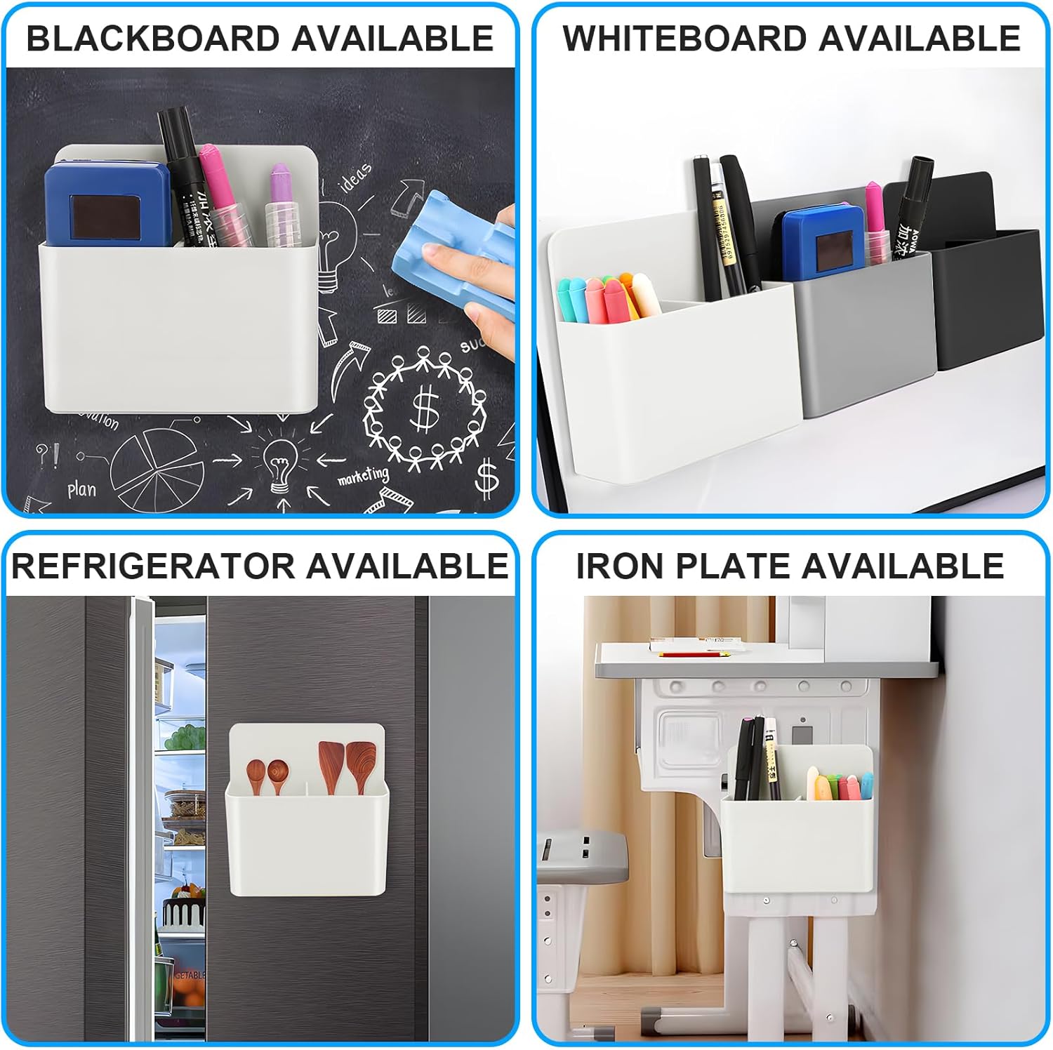 Strong magnet is fixed into the whole back of this pencil holder. It only fits for metal surface, not suitable for glass board or plastic board.Compatible with whiteboards, dry-erase boards, refrigerator, locker, cabinet, container and other magnetic surfaces.