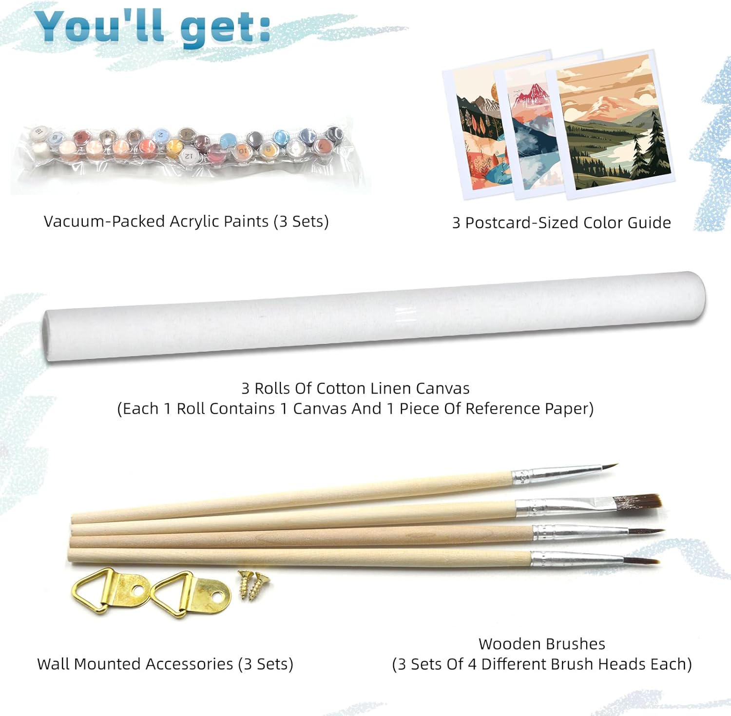 【Abundant Paint By Number Kits】There are 3 sets of paint by numbers for adults, each set contains: pre-printed canvas, postcard guide, paper numbered canvas reference x 1, acrylic paint, wall-mounted hooks and screws x 1 set, and 4 nylon brushes of different sizes. The adults’ paint-by-number kits can give full play to creativity and is the perfect way to relax and release artistic talent