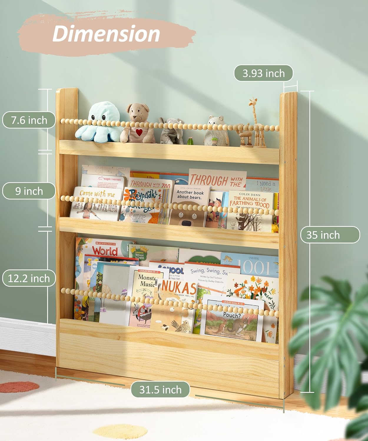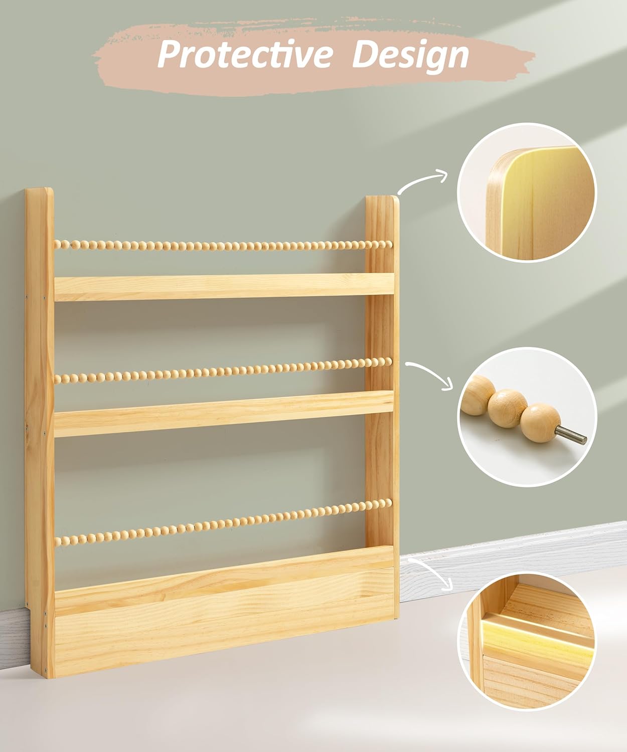 【Natural Material】: The kids bookshelf is made of natural solid pine wood, which is durable and sturdy. The wood beads add more funny and cute style. The surface of kids book shelf has finished, smooth and easy to clean