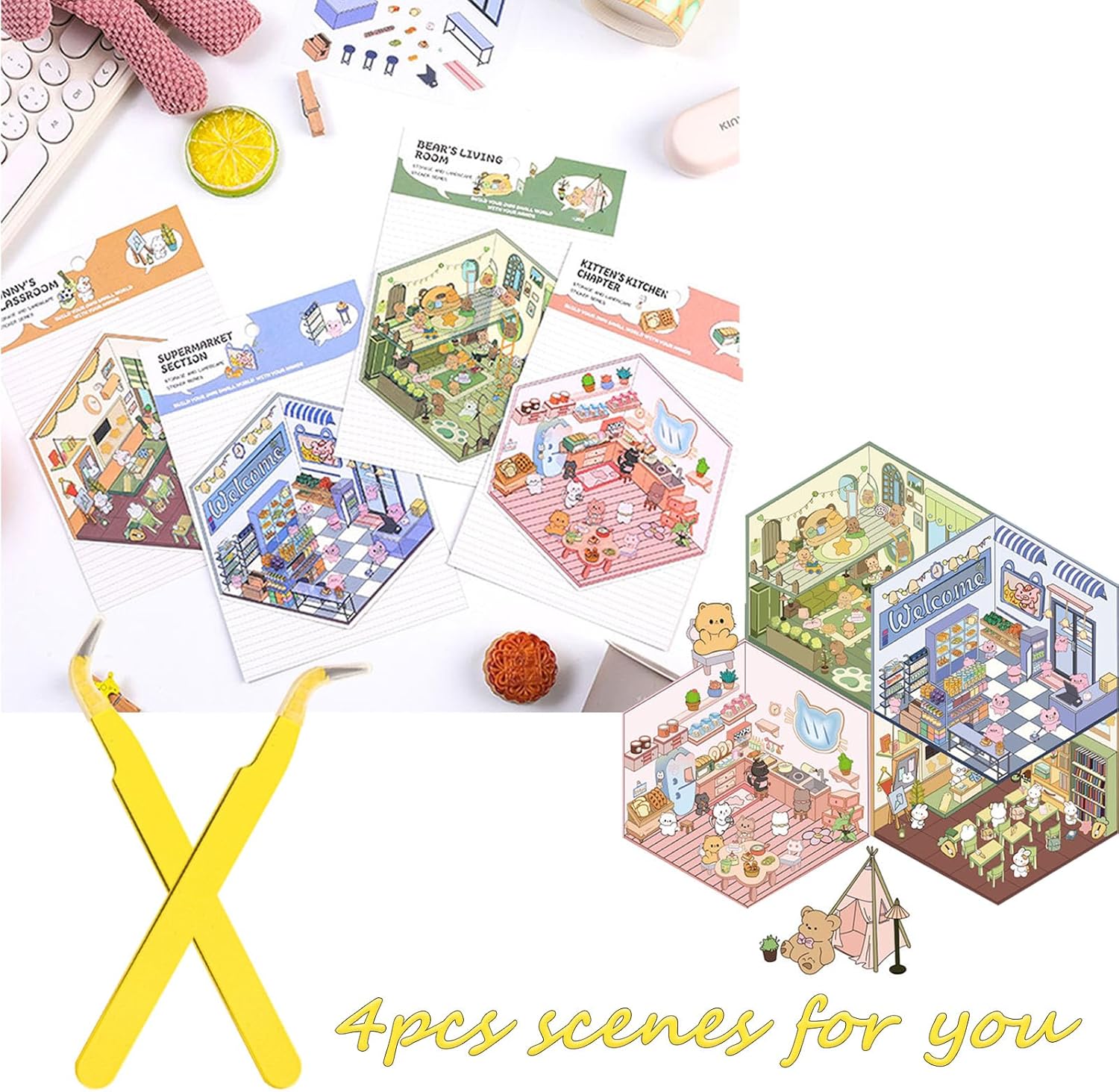 3D Sticker Scene, 6pcs DIY 3D House Stickers Set, Sticker Scenes for Adult Kids Gifts to Make Own Mini Sticker Rooms Book (Tool *2pcs)