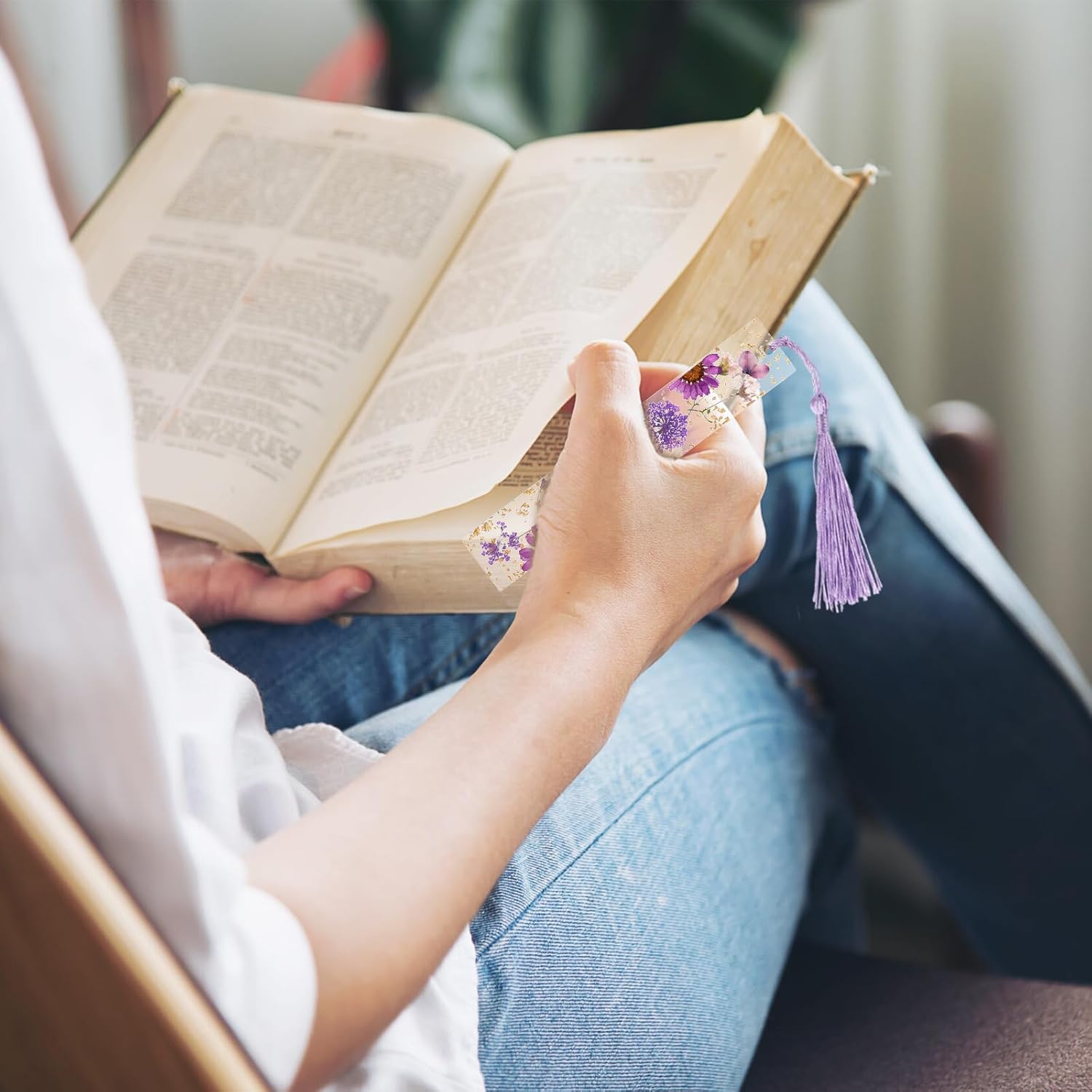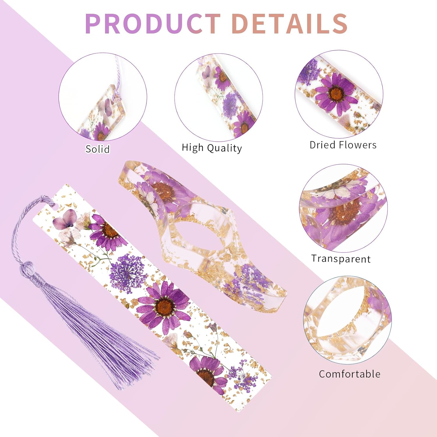 Package Content: Includes 2 resin dried flower bookmarks with tassels and 2 resin dried flower book holders in blue and purple colors.