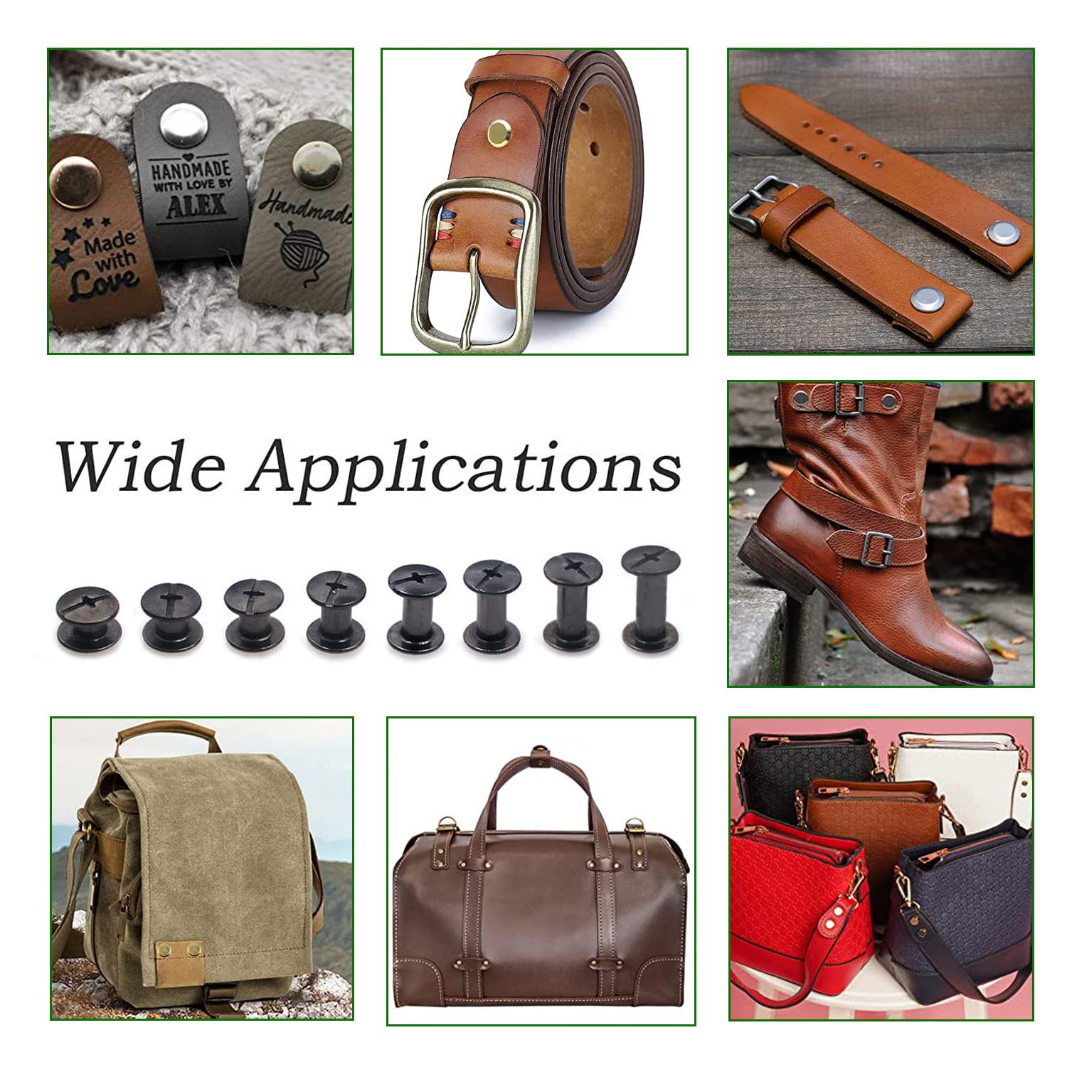 【Usage】: Leather screw rivets ideal for use in a wide range of applications such as repairing furniture, handbags, shoes, belts, wallets, and more.