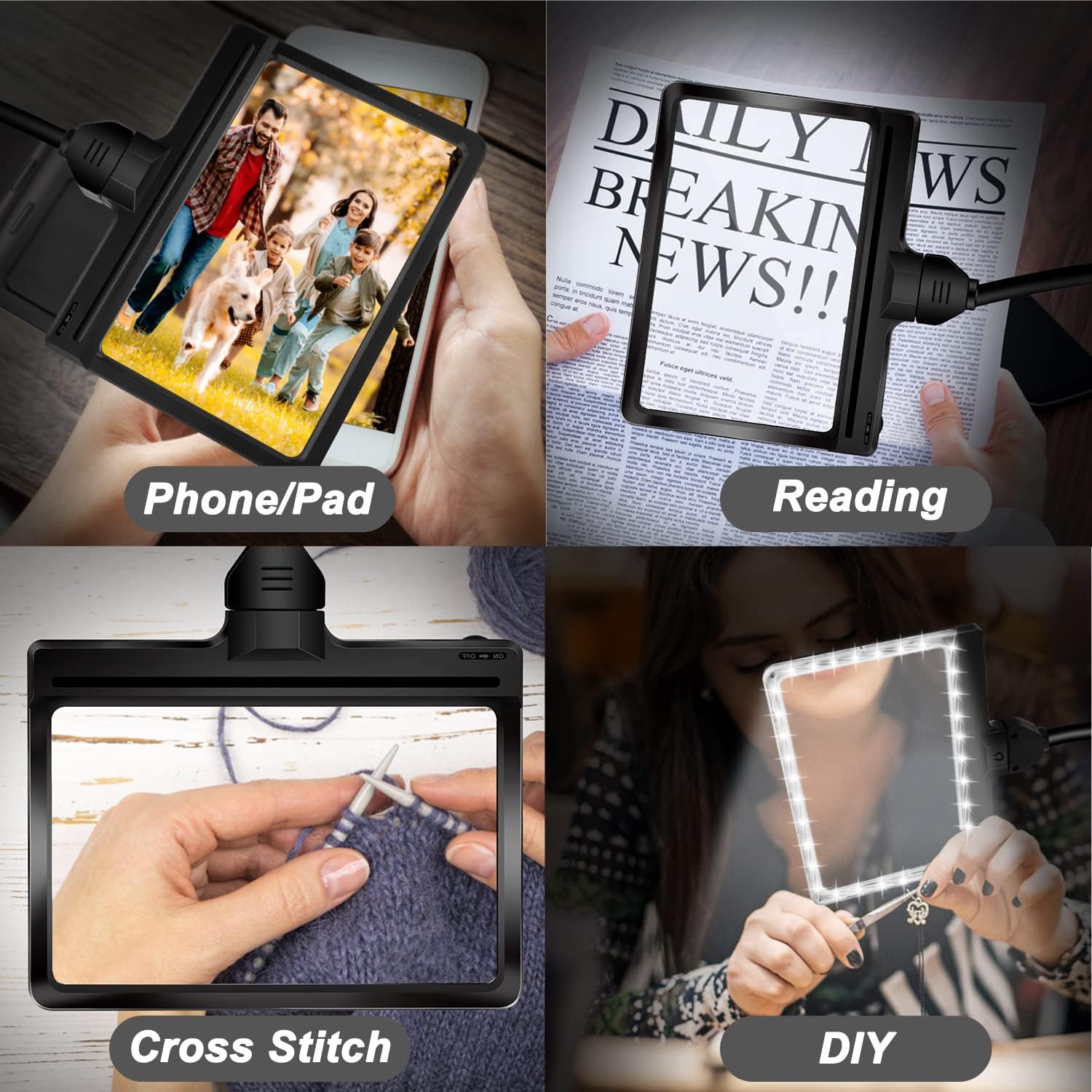 [Hand-Free/Handheld] Detachable desktop magnifying lamp, you can connect/disconnect the magnifying glass with the stand at any time, after connecting the stand, the gooseneck is measured 17 inches long and can be bent in any direction for your needs. There are two phone stands located on the base where you can place tablets at your desired angle to enlarge the screen.