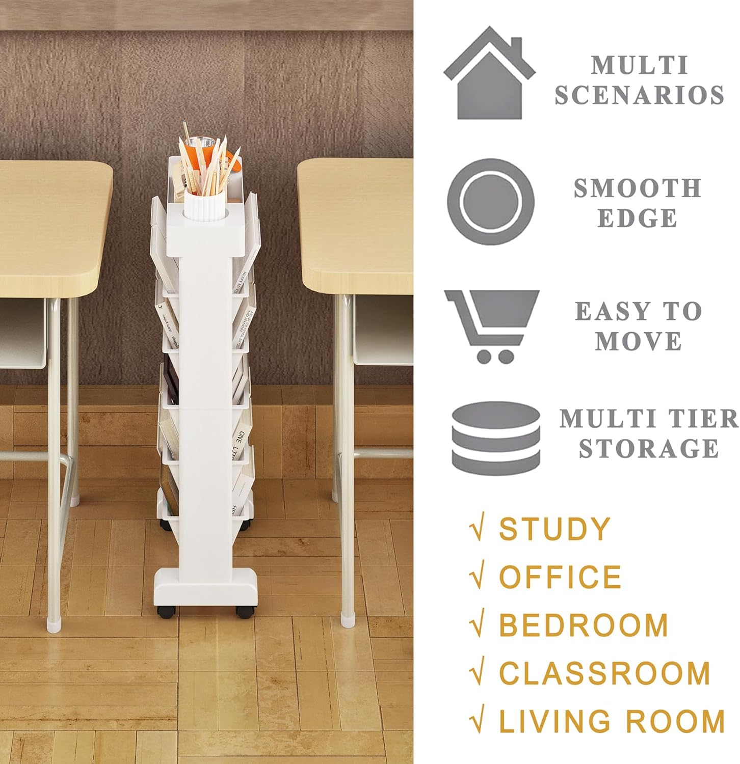 6-Tier Bookshelf, Book Storage Organization with Wheels Mobile Rolling Bookshelves Cart for Home Office Kids’ Study Room School, White