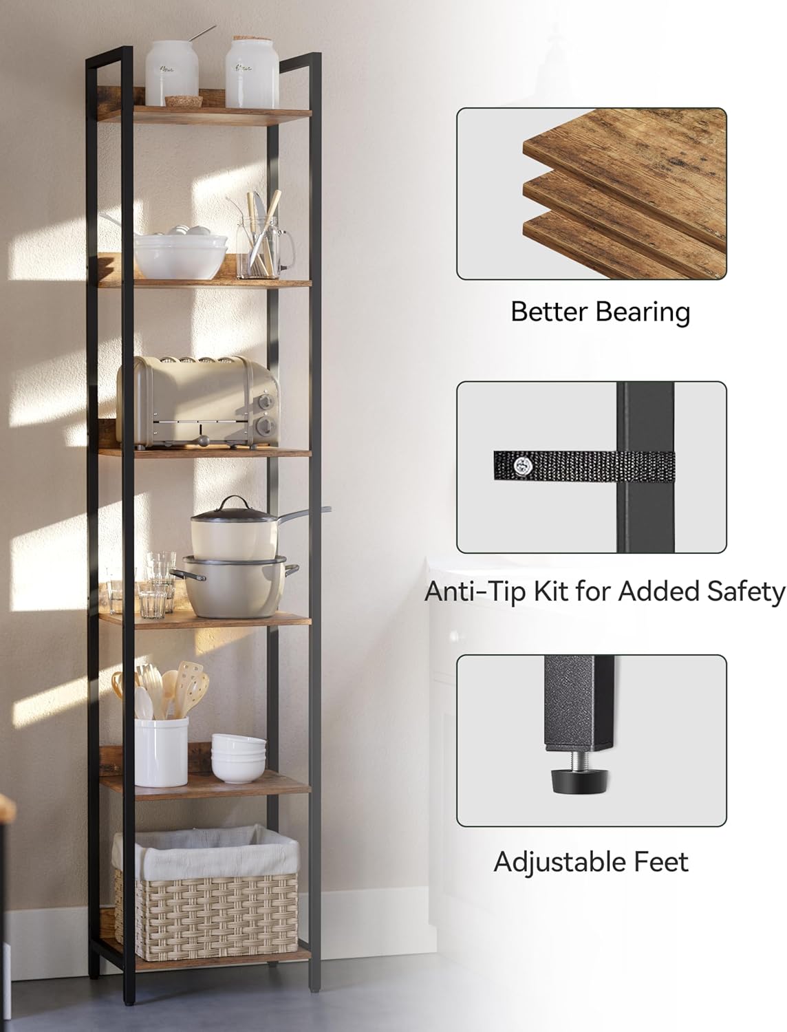 Color: Rustic Brown, BlackMaterial: Particleboard, SteelProduct Size: 11.5″D x 15.7″W x 72.6″HProduct Weight: 23.8 lb (10.8 kg)Max. Static Load of Each Tier: 25 lbMax. Overall Static Load Capacity: 150 lb