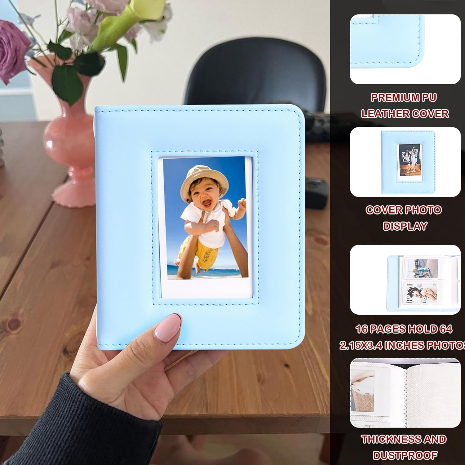 Unique Design: The 64 pockets 2×3 photo album cover has a cut-out design for you to display the photo; 16 pages of high-transparency PVC inner pages can hold 64 photos 2.15×3.4 inches, and the side inserts are convenient for storing and taking out photos