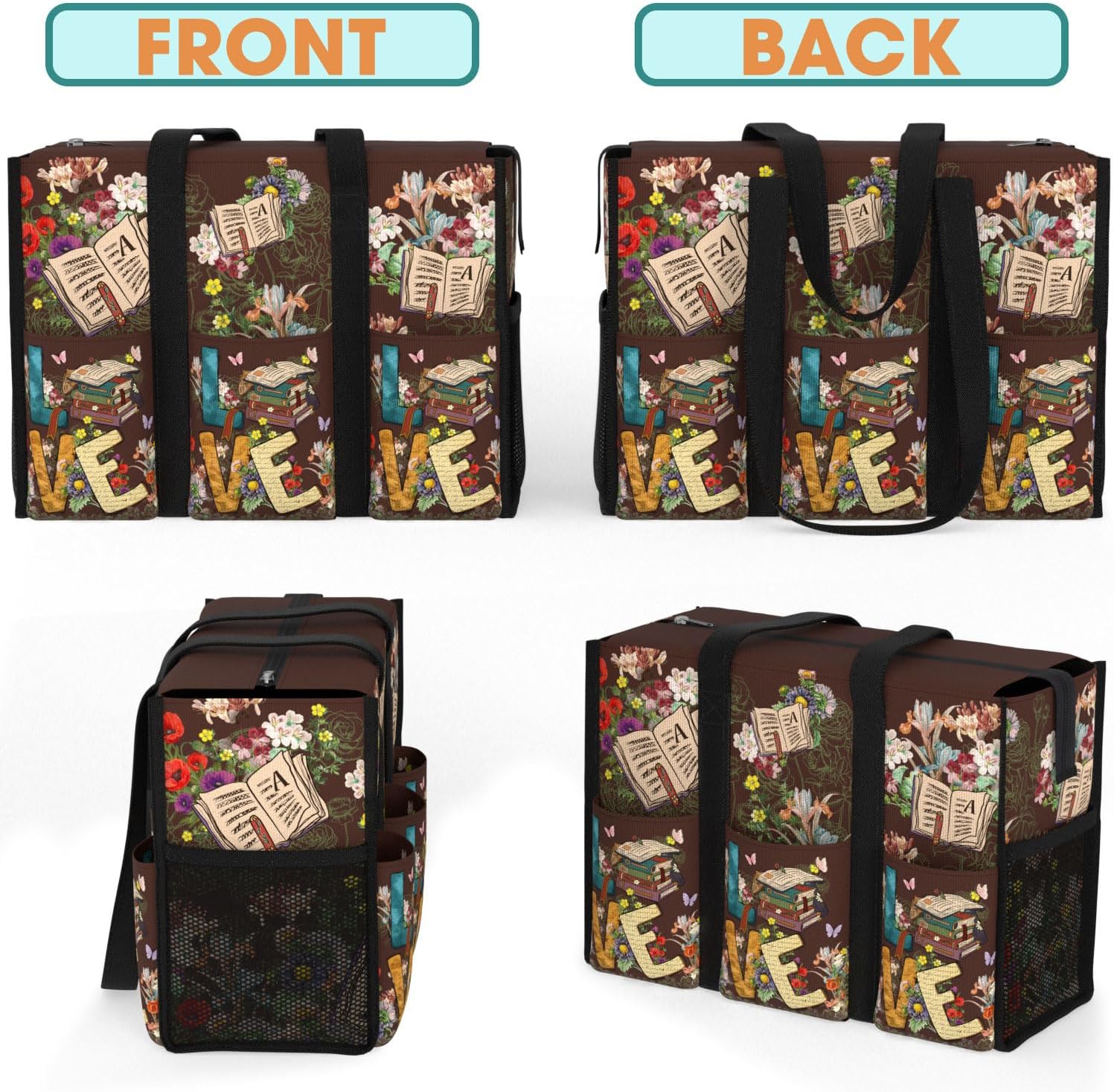 84hoods Large Waterproof Tote Bag with Multiple Convenient Pockets and Zipper. Gift for Women Book Lover, Librarian.