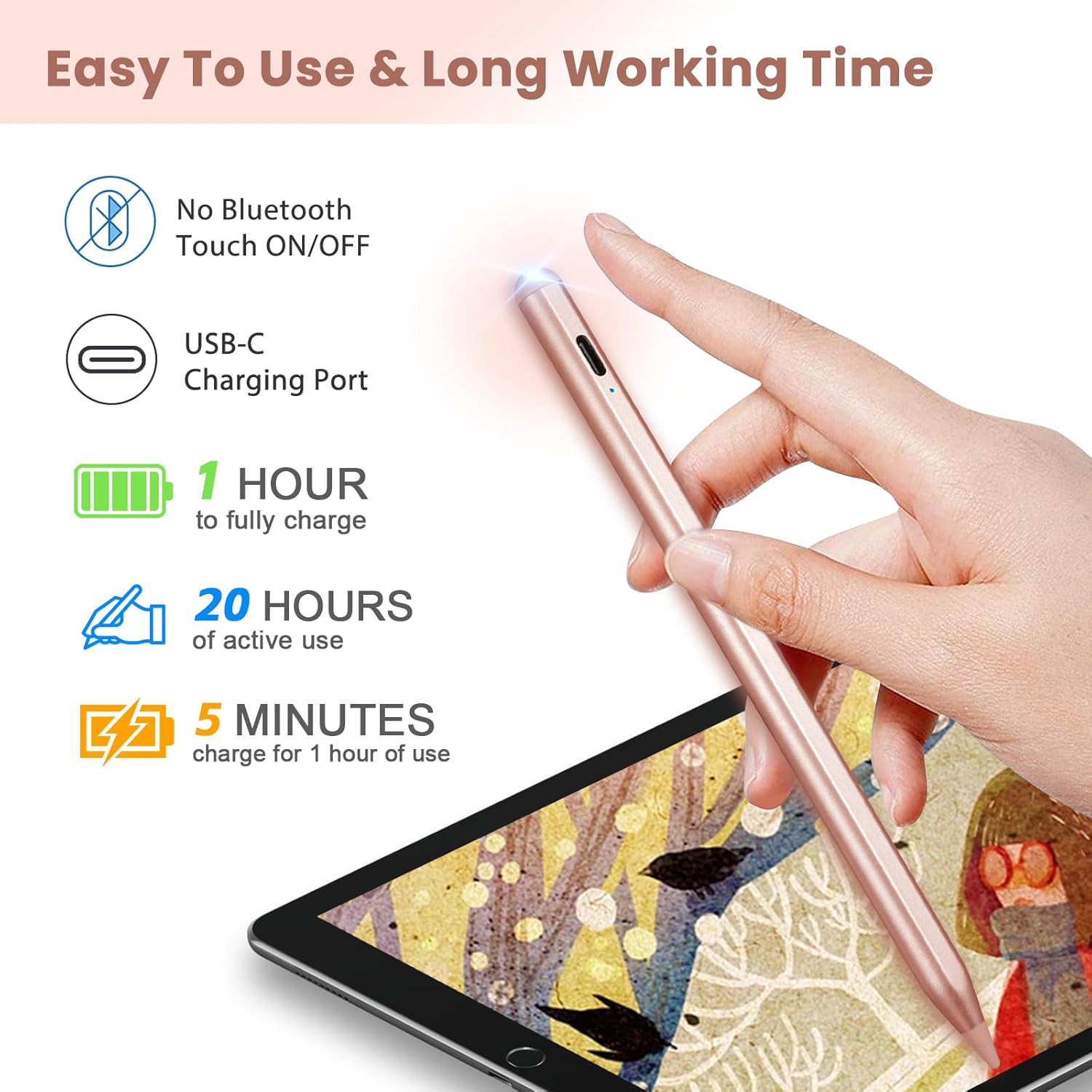 Smart Power Saving Design: This active stylus pencil has a very long working time with good quality built-in lithium polymer battery. You just need to charge it up for about 90 minutes, then it can support up to 20 hours of working.A smart and intelligent power saving design will help to switch the pen to sleep mode or power off after no activity of 5 minutes/30 minutes.