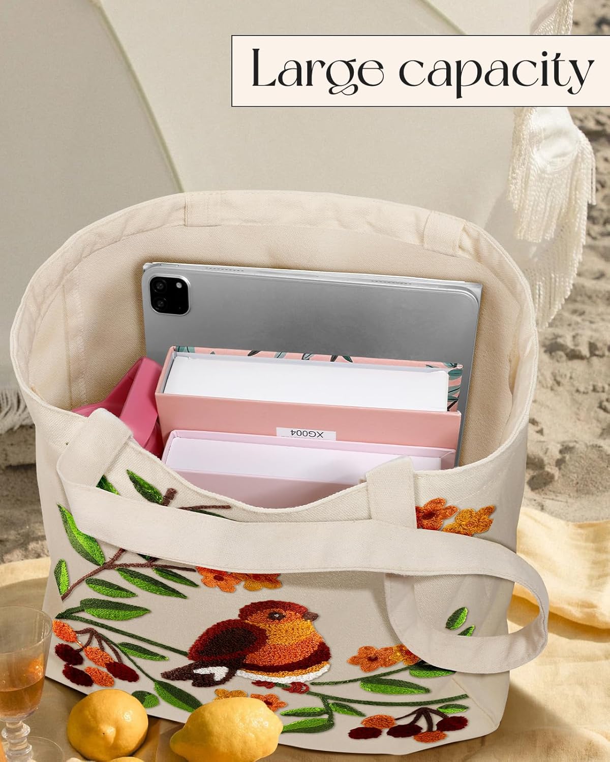 Aesthetic Embroidery Tote Bag for Women – Reusable Canvas Cute Shoulder Bag for Shopping, Grocery, Work, Book