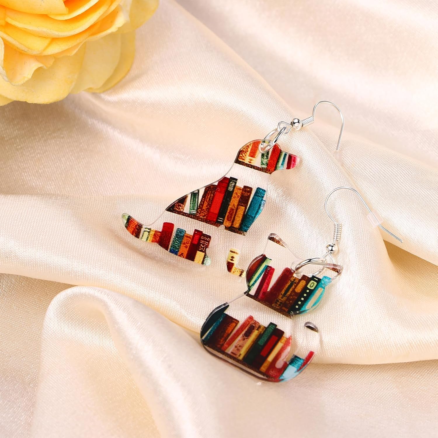 Aroncent Book Themed Cat Earrings: 2 Pairs Acrylic Bookcase Dangle Fun Cat Dog Earrings For Book Lovers Gift Graduation Teacher’s Day Appreciation Back To School Gifts