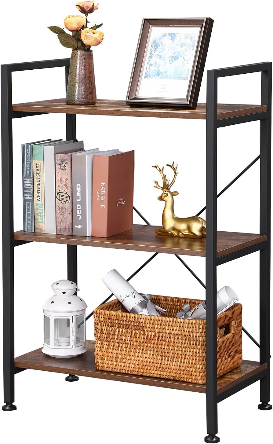 BEWISHOME 37″ H 3 Tier Bookshelf, Rustic Small Book Shelf for Small Spaces, Brown Wooden Shelves for Bedroom Living Room and Home Office, 13.58″ D x 24.21″ W x 37″ H, JCJ32Z