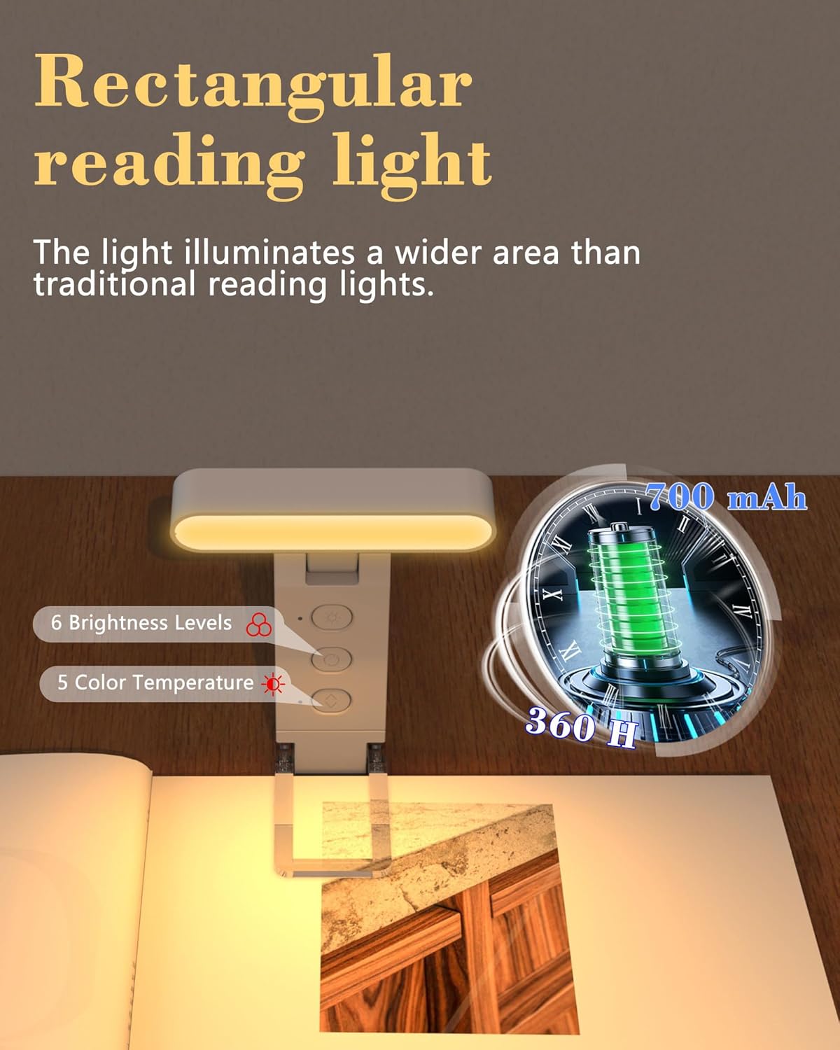 Adjustable Reading Light – With 5 color temperature modes and 6 brightness levels, rechargeable book light allows you to customize the light to your preference and minimize eye strain. The warm light is ideal for bedtime reading.The book light you describe offers versatile lighting tailored for comfortable reading in bed