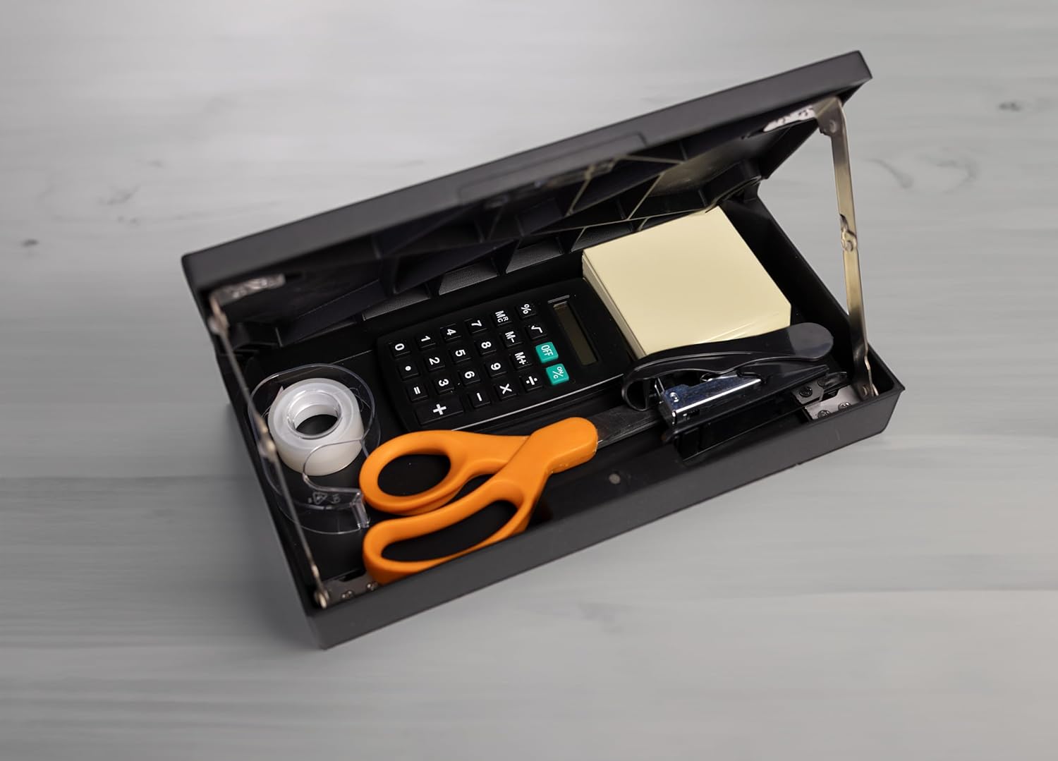 There are two large compartments held closed with magnets. The one in the front is ideal for hightlighters, pens, pencils, erasers, paper clips etc. The one in the back is larger. This compartment can easily fit your phone charger, sticky notes, white out, and bookmarks, etc.