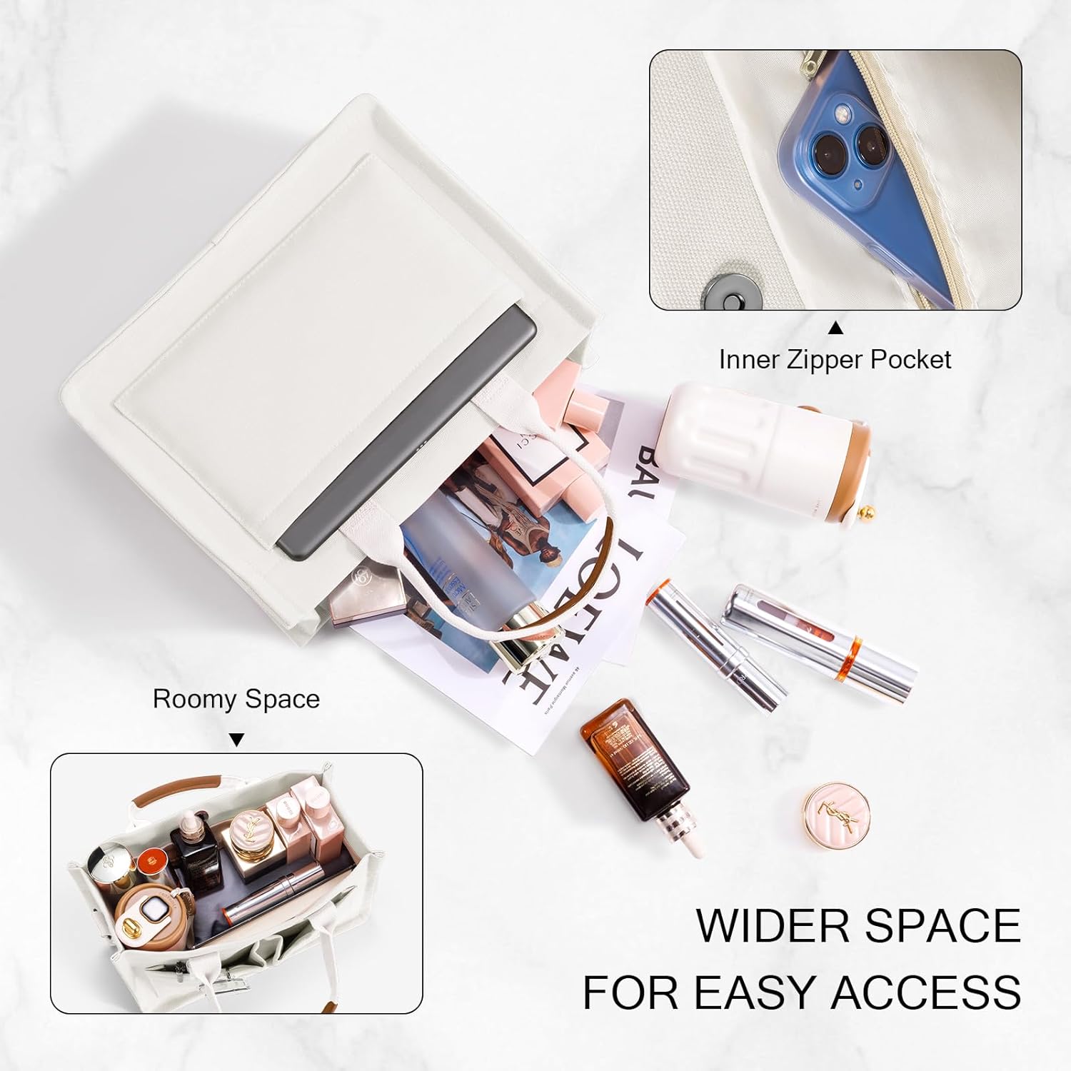 Featuring a square and three-dimensional shape that maximizes space utilization, The everything tote bag is suitable for various occasions such as office, college, travel, shopping, camping, etc.