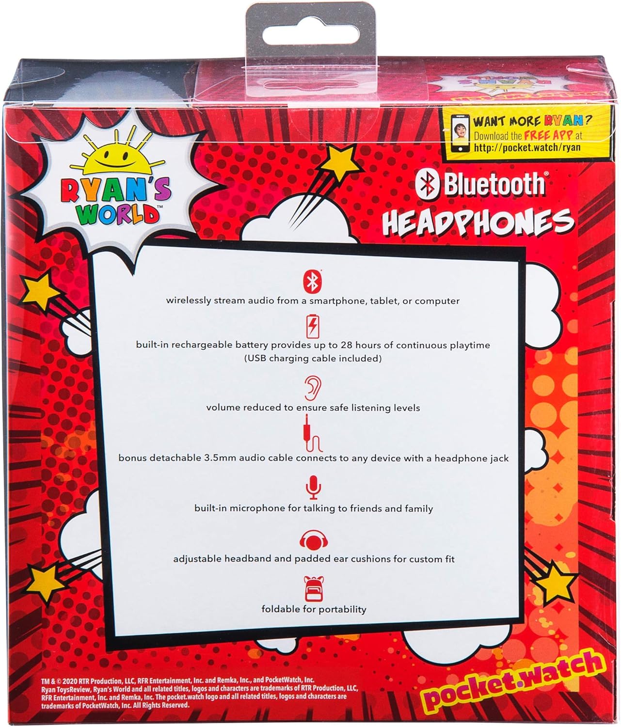 The new Ryans World Bluetooth headphones are here so you can enjoy whatever music you like wirelessly. These headphones have reduced volume to ensure safe listening levels for kids. The built- in rechargeable battery allows up to 28 hours of continuous playtime. Included is a built-in microphone for talking to friends and family on a video call or Zoom meeting. A bonus detachable 3.5mm audio cable is included so you can connect to any device with a headphone jack. Adjustable headband and padded ear cushions provide maximum comfort and a custom fit. The foldable design is ideal for convenient travel and storage. Ryans World headphones make a perfect gift or birthday present for your little one!