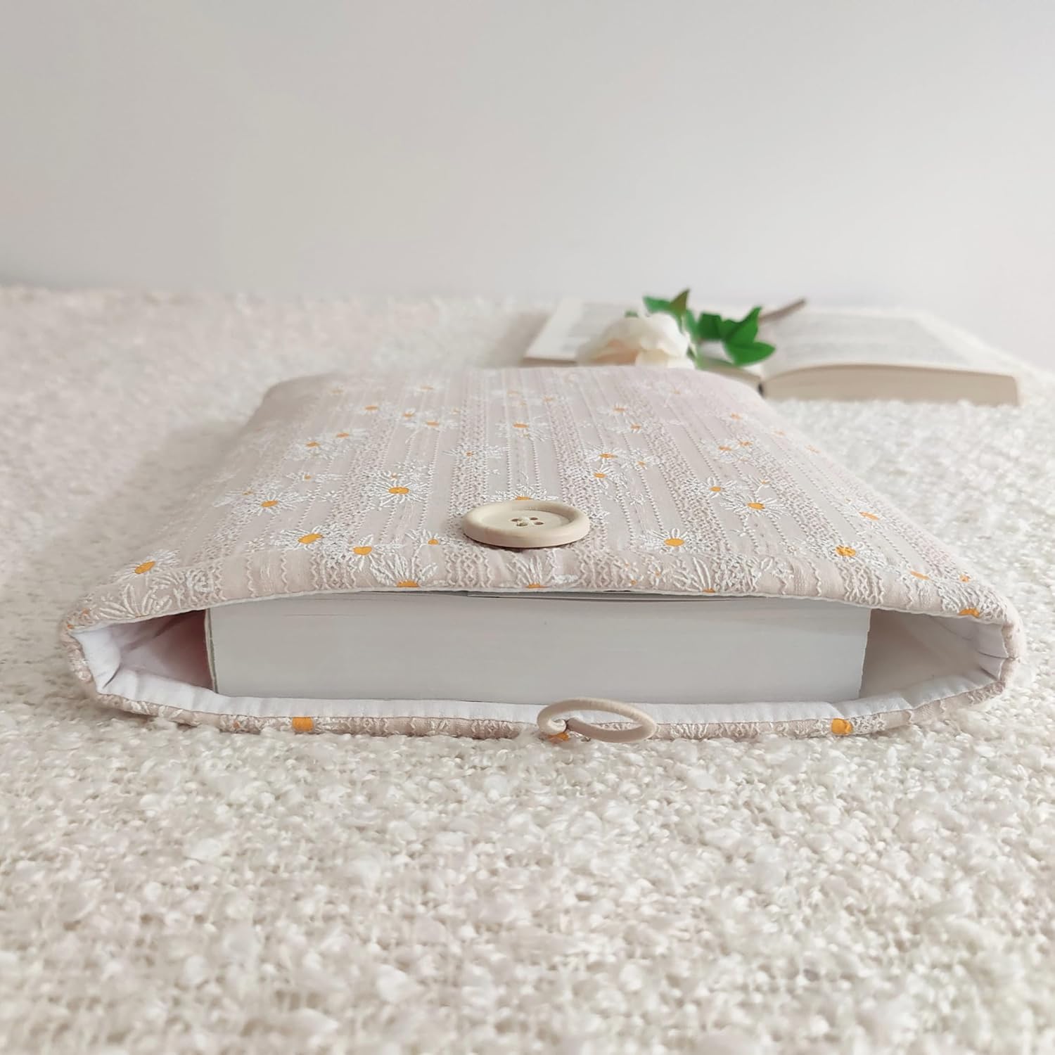 Embroidered Book Sleeve with Daisy Design – Elegant Book Cover, Padded Protector for Paperbacks & Hardcovers, Ideal for Book Lovers, Wooden Button Closure (Beige – Daisy Blossom, Large)