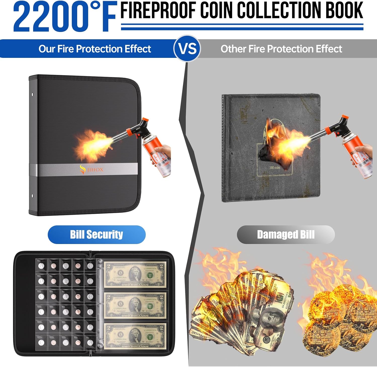 Fireproof Water-resistant Protecting Valuables: Our coin collection book is made of non-itchy, non-stick, dust-proof silicone-coated fiberglass that withstand temperatures up to 2200°F which has been passed by SGS TEST(UL94 VTM-0 Certified). In case of fire, coin collection supplies buy you more valuable time. Equipped with special reflective strips, the coin album can be found immediately even in dark and confusing environments. Used it with a safe box protecting your coins will be foolproof.