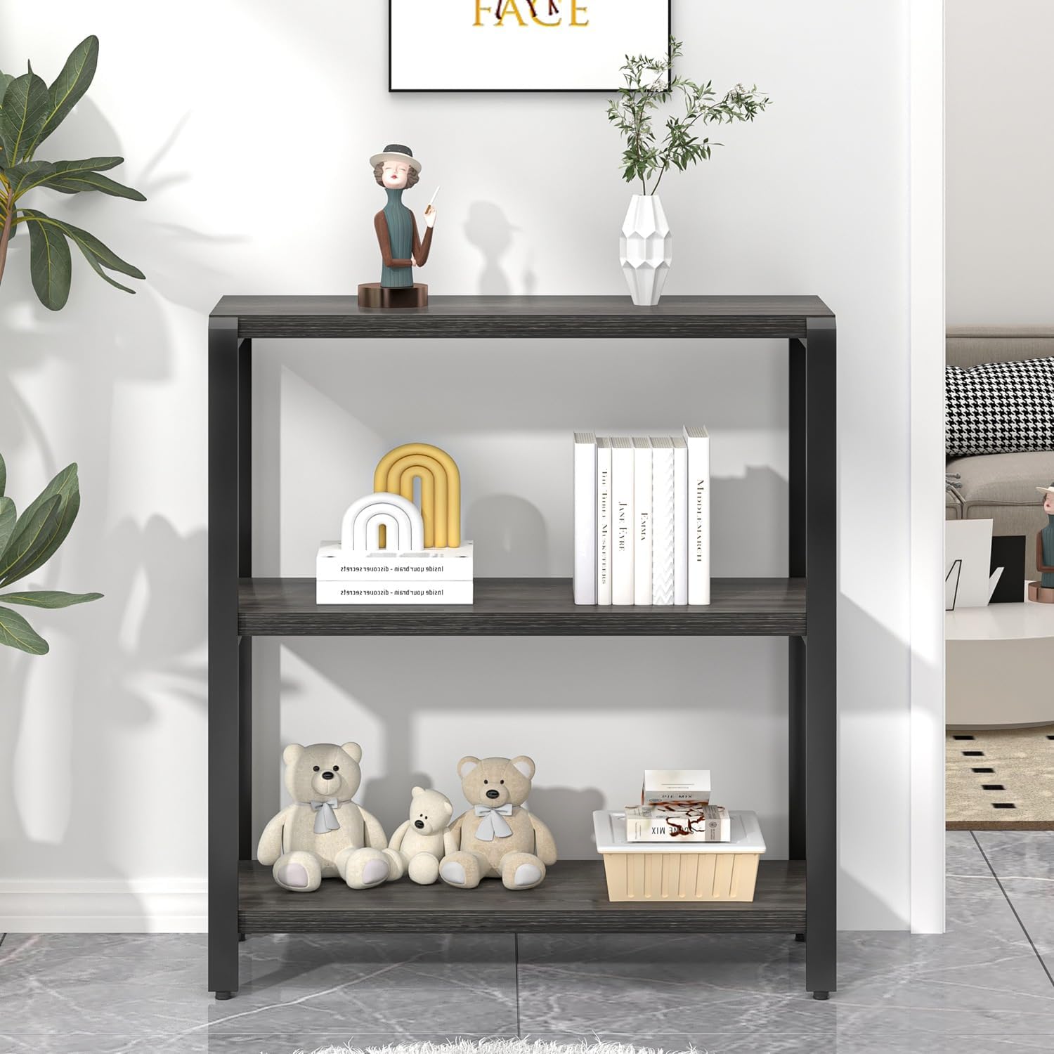 Industrial Charm: This small bookshelf exudes a stylish Industrial vibe, featuring a dark grey tabletop paired with sleek black metal legs. It perfectly showcases the charm of vintage and farmhouse styles.