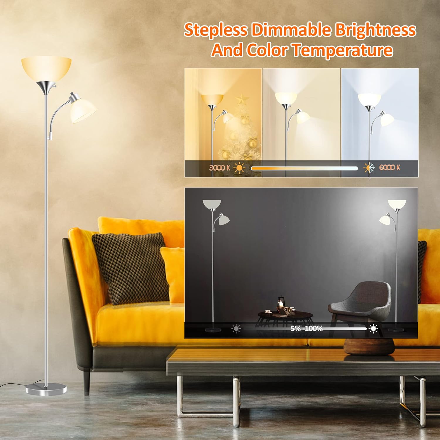 [SPACE-SAVING]: Standing lamp great for reading room and living room, the sky torchiere floor lamp only takes up a little space thanks to its slim, space-saving design. You can assemble this lamp without using any tools.This modern slender lamp can slide into narrow corners unobtrusively, and the base fits under your sofa. This is great because the mother and daughter lights on the flexible arms can be extended to the sofa to direct the light towards your reading or handicrafts.
