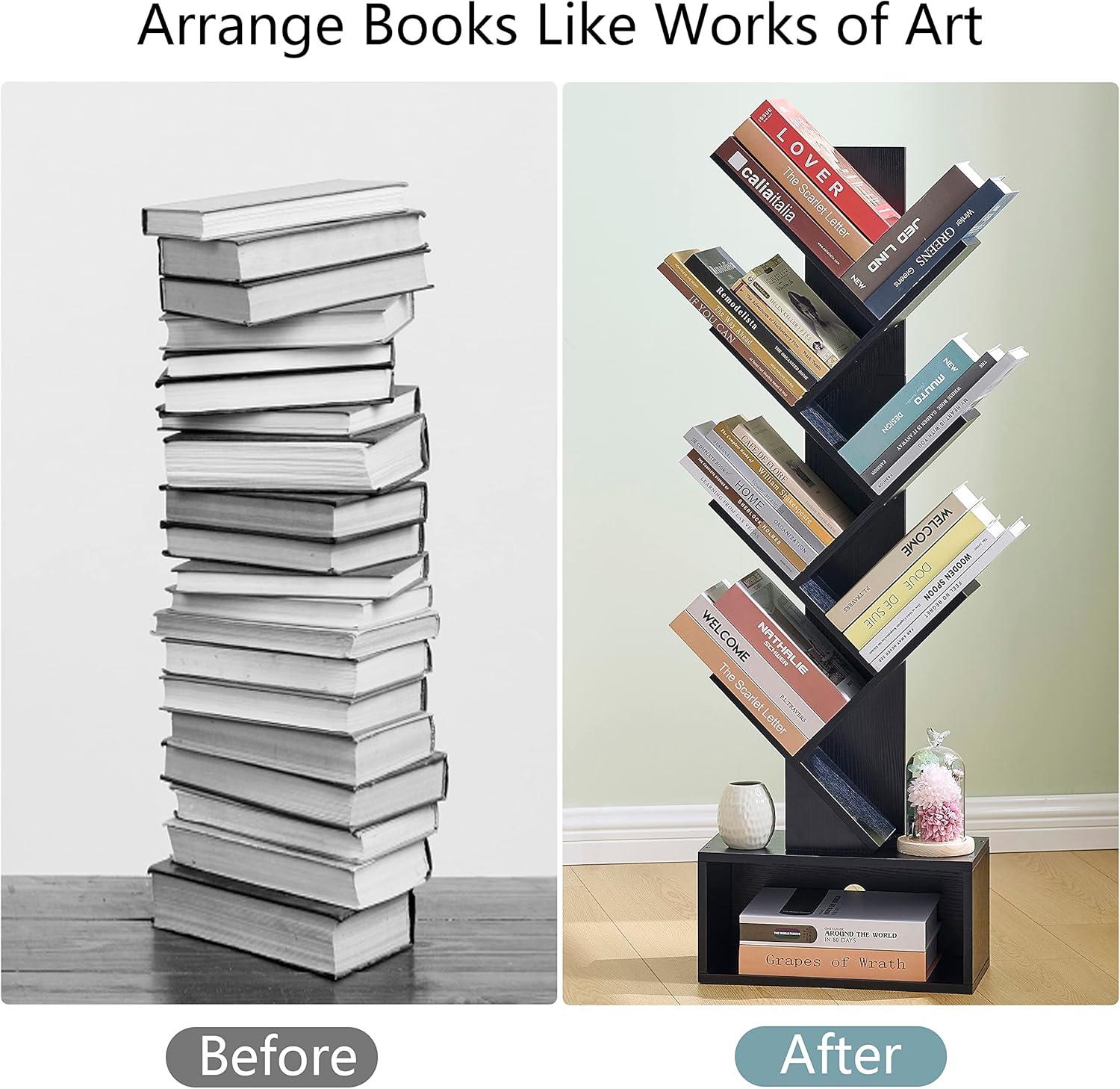 [Space Saving and Ample Storage Capacity] Our 6-tier tree bookshelf offers 6 open shelves and a large drawer for storage. Whether it’s books, decorations, CDs, magazines, video games, manga, novels, speakers, potted plants, photo albums, crafts, or other collections, you can easily organize them on this bookcase. With its narrow design, it can be moved easily to any corner or small space.