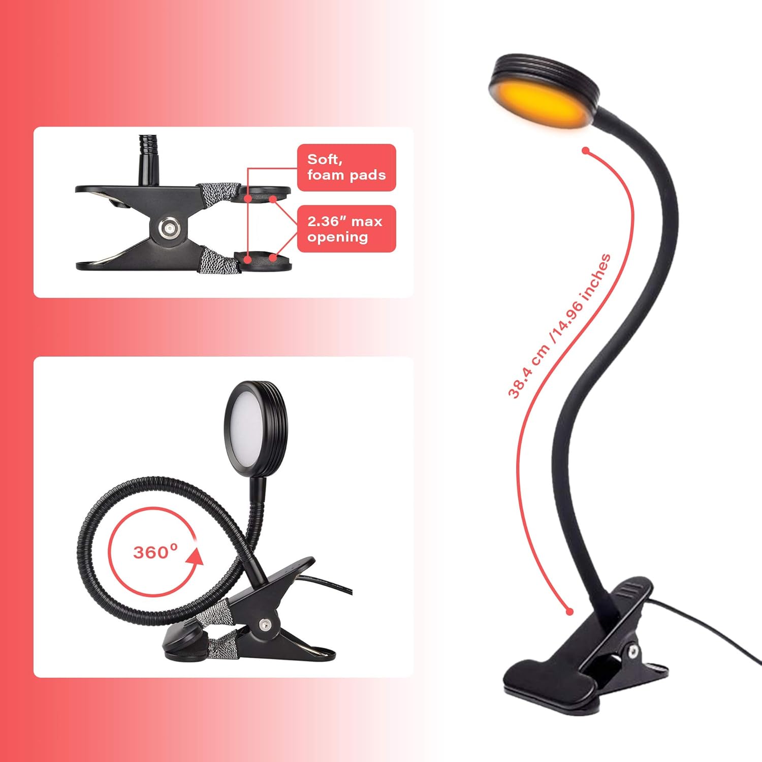 This Hoogalite features a strong, sturdy clamp with scratch-resistant foam pads and a 2.36″ maximum bite that can clamp onto anything. With a 360 degree bendable neck, you can customize the lighting angle to best fit your needs. 5 foot long USB power cord and plug-in wall adapter are included with your Hoogalite purchase.
