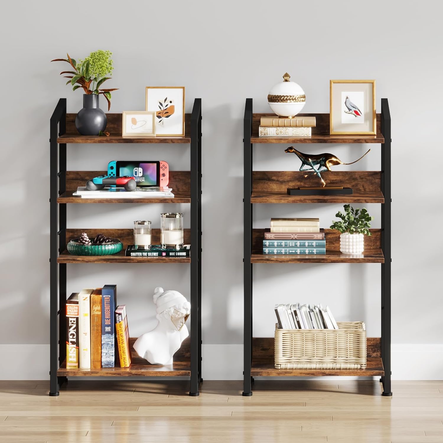 Vintage Wooden Bookcase: This bookshelf adds a touch of linear industrial charm and rustic vintage coziness to your room. The neutral colors and simple design match perfectly with different furniture styles, making this bookshelf an excellent choice for any home décor