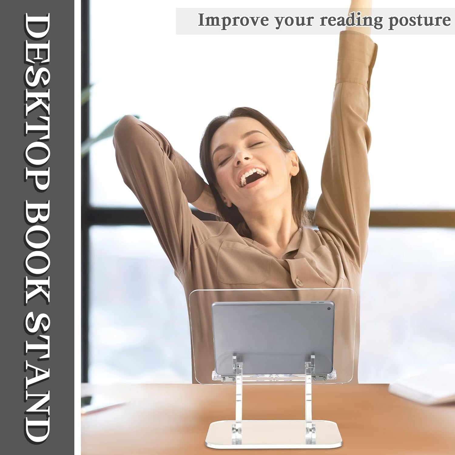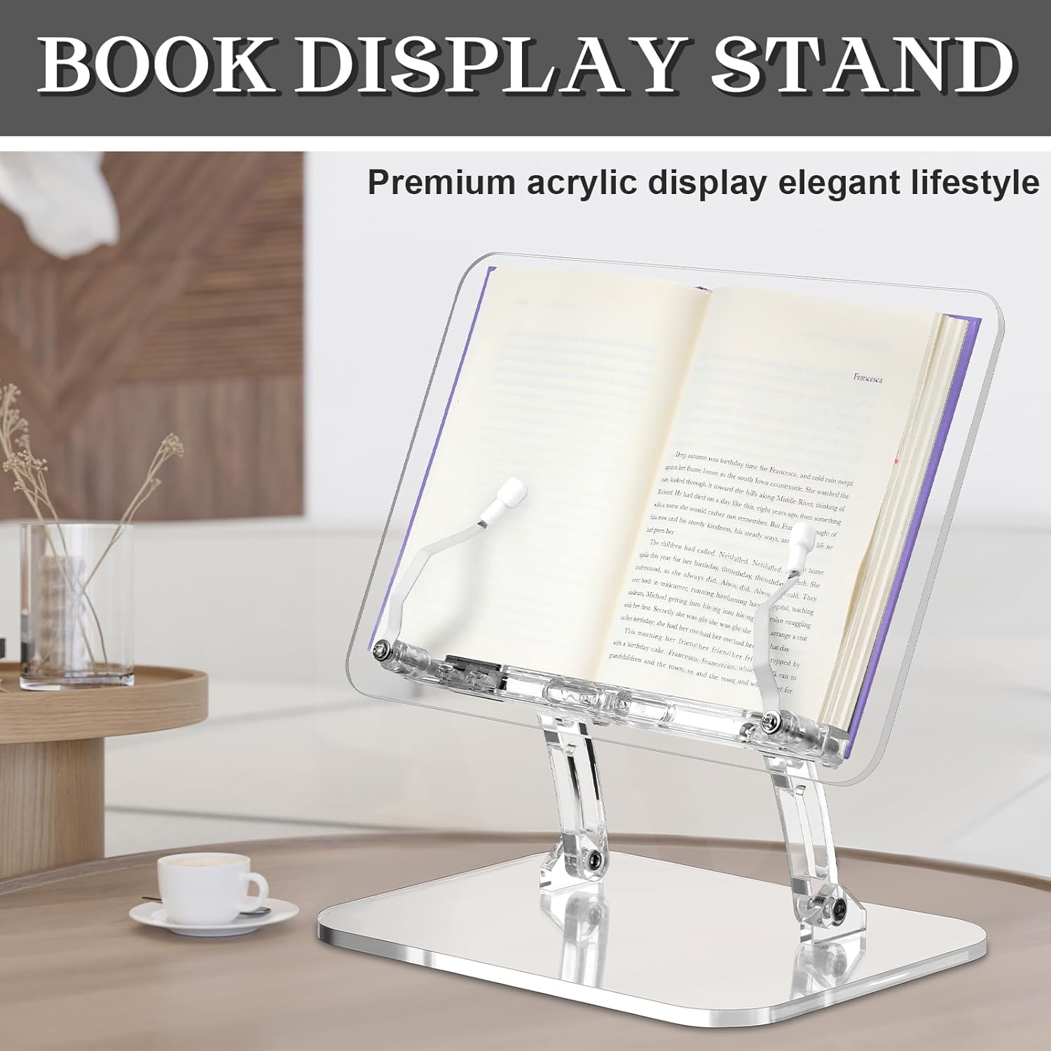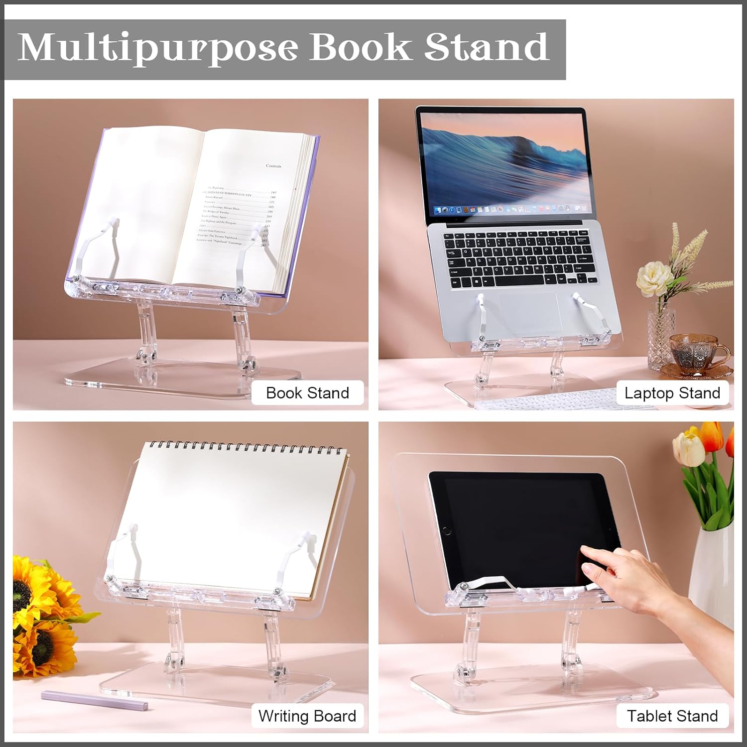 Ireer Adjustable Acrylic Book Stand for Reading, Book Holder with Page Clips, Foldable Desktop Riser for Laptop, Recipe, Textbook, Cookbook Stand, Clear Hands Free Acrylic Book Stand