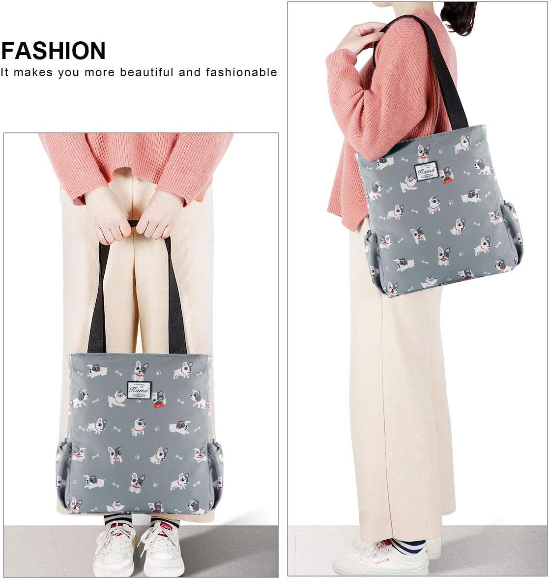 Two shoulder straps Soft Polyester composite fabrics,Foldable,easy for shopping, Light weight,fashion and economicYou can convenient & comfortable to wear in 3 ways: Tote, Shoulder and Cross Body.
